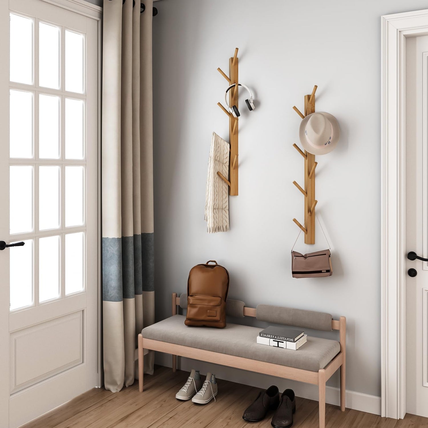 TIOPGHAD 2-Pack Wood-Wall-Mounted-Coat-Hooks, Bamboo Vertical Coats Rack Holder Hanger with 8 Hooks Entryway Hanging Wooden Racks for Hanging Jacket Coat Hat in Entryway Office Bathroom(Natural)