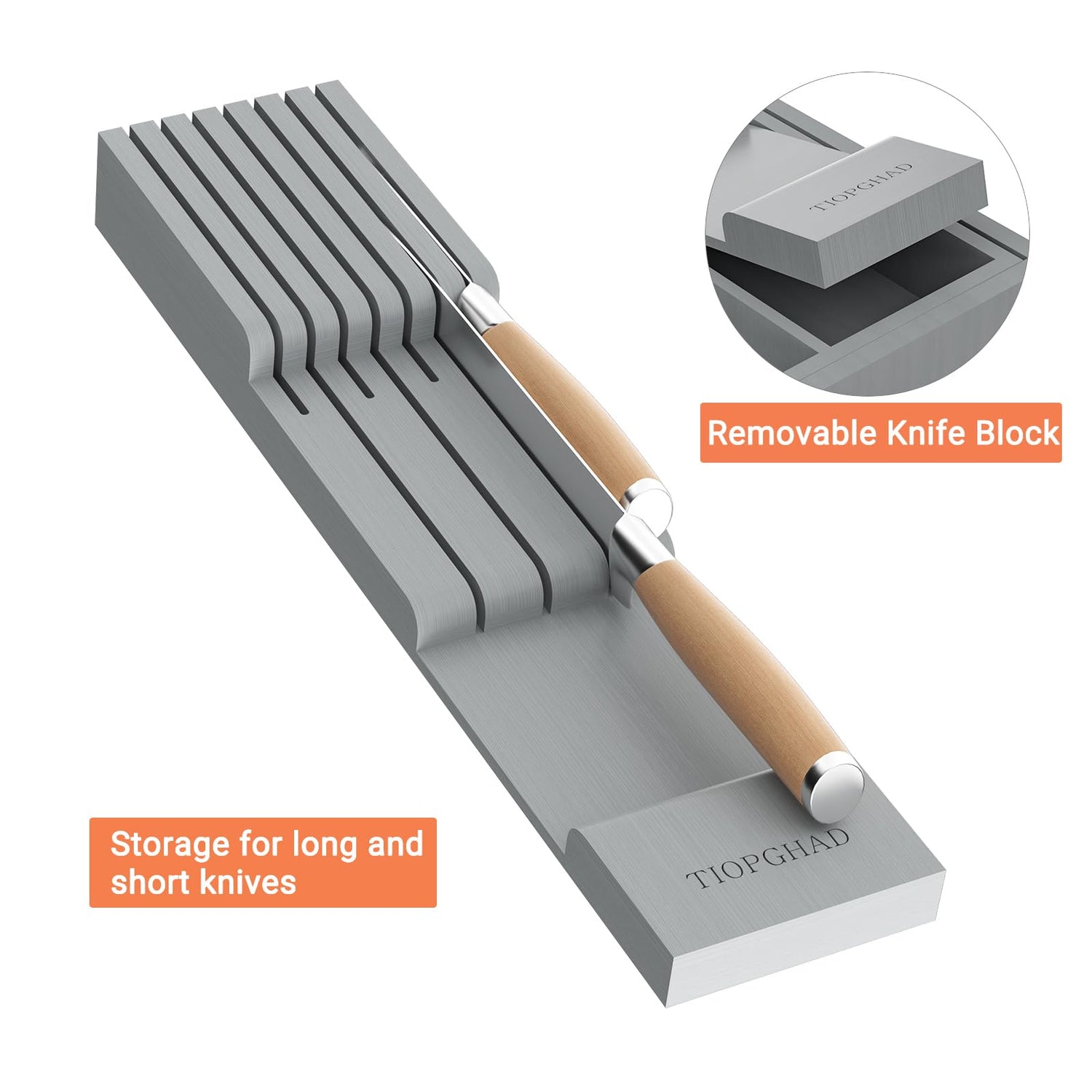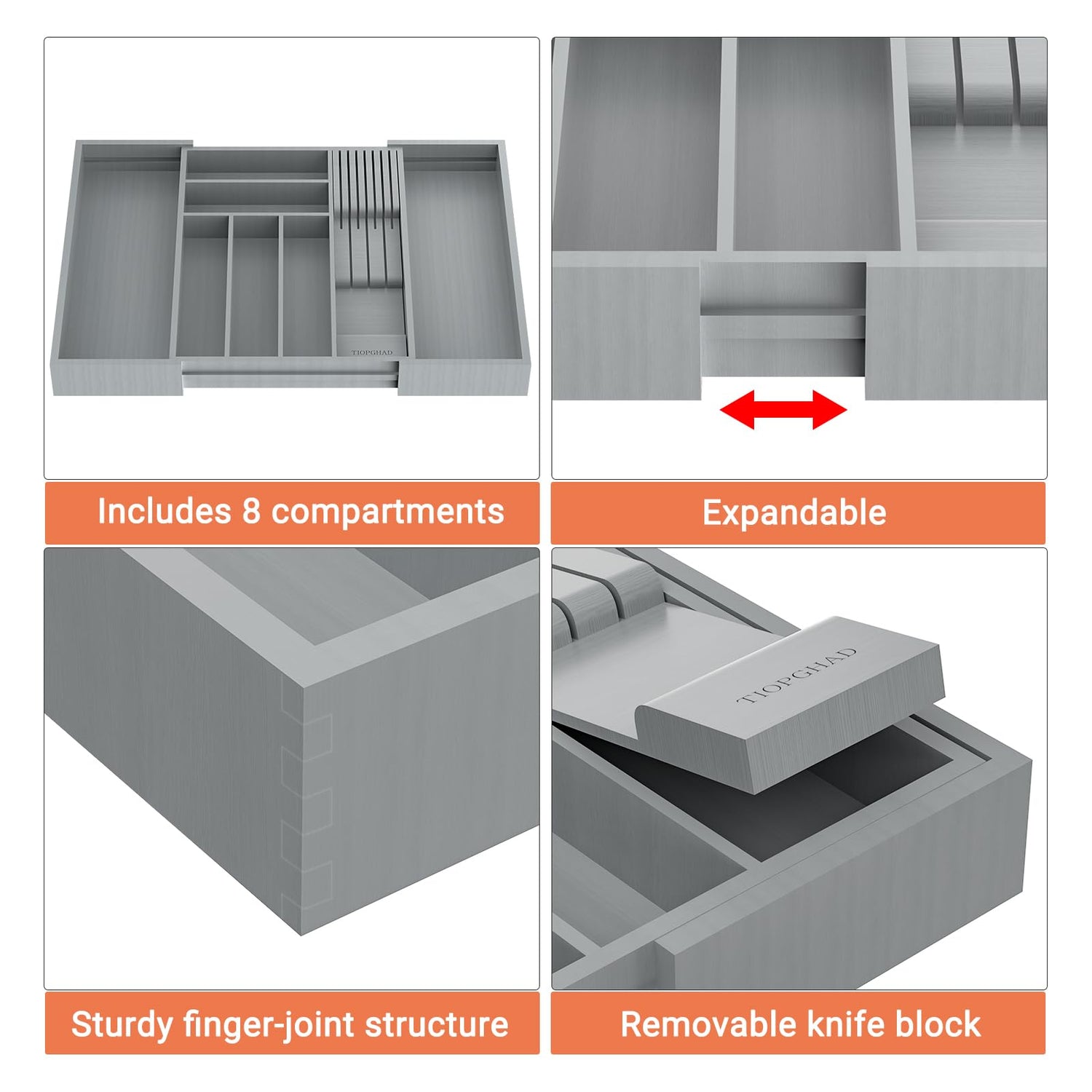 TIOPGHAD Bamboo-Silverware-Drawer-Organizer-Kitchen, Expandable Utensil Holder Cutlery Tray Flatware Organization Adjustable Wood Tableware Dividers Storage (with Removable Knife Block)(Grey)