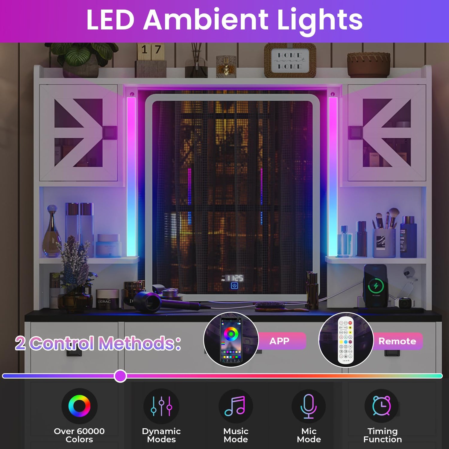 - 【Makeup Vanity with Ambient Light】There are 2 LED light tubes on both sides of the mirror, bringing you a great visual feast when you are relaxing and entertaining. These two atmosphere lights have 2 control methods: mobile APP, and remote control. There are more than 60,000 static light colors, a variety of dynamic light modes, music mode, microphone mode and timing function controlled by the mobile APP.