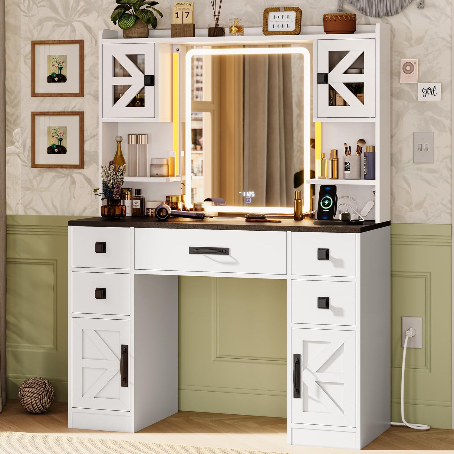 Tiptiper Farmhouse Vanity with Touch Screen Mirror & Time Display, Large Makeup Vanity with Charging Station, Vanity Desk with Mirror and RGB Lights, Makeup Desk with 5 Drawers, White & Black