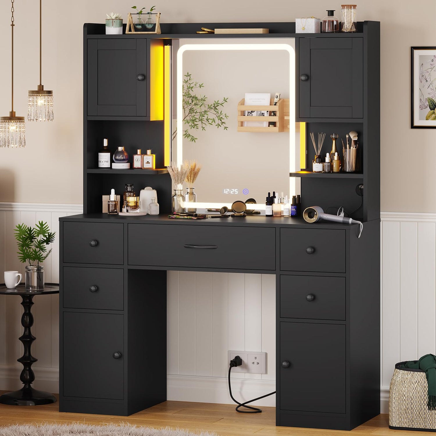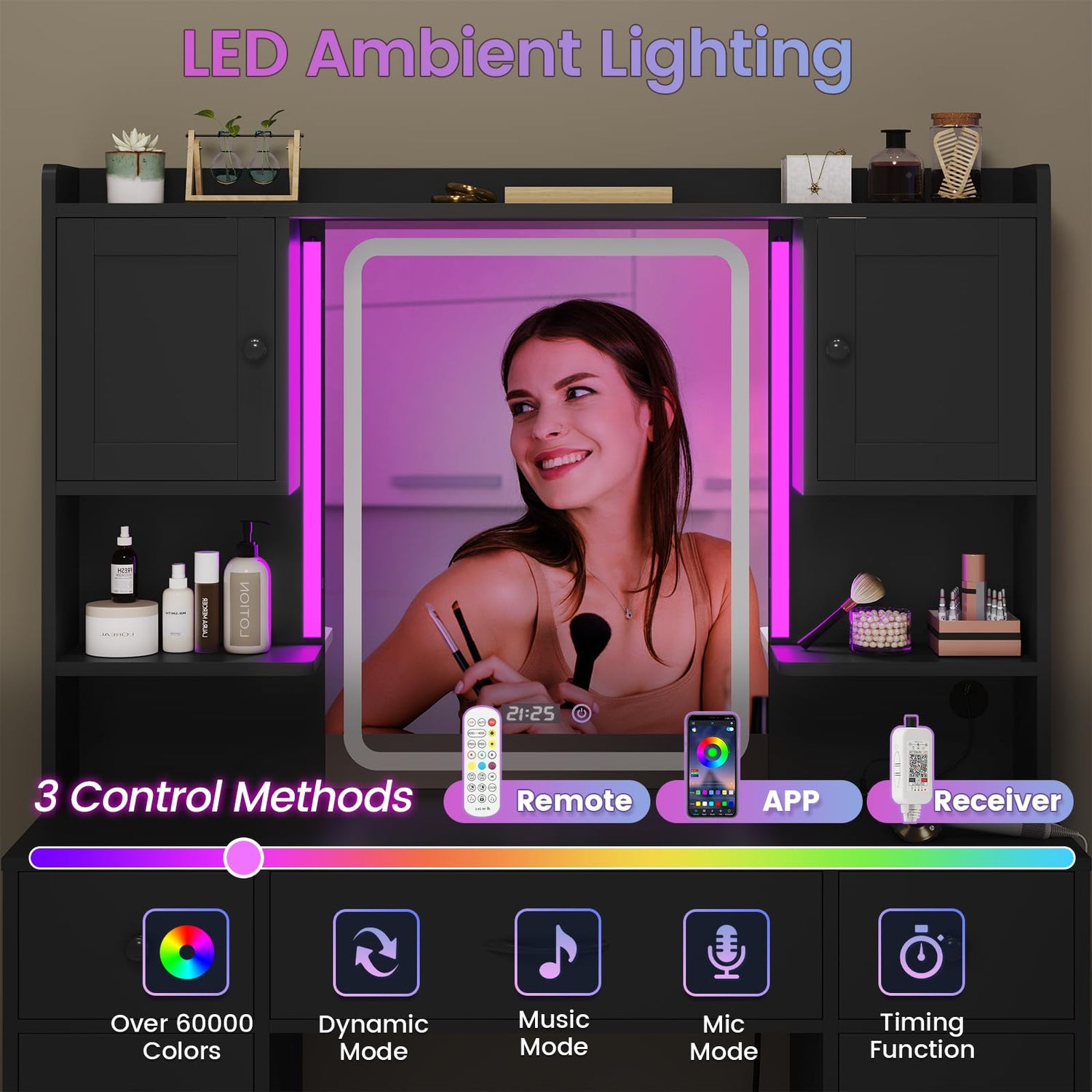 Tiptiper Large Makeup Vanity Desk with Mirror and Lights, Vanity Table with Charging Station & Time Display & Ambient Light, Makeup Table with Drawers & Storage Cabinets, Black
