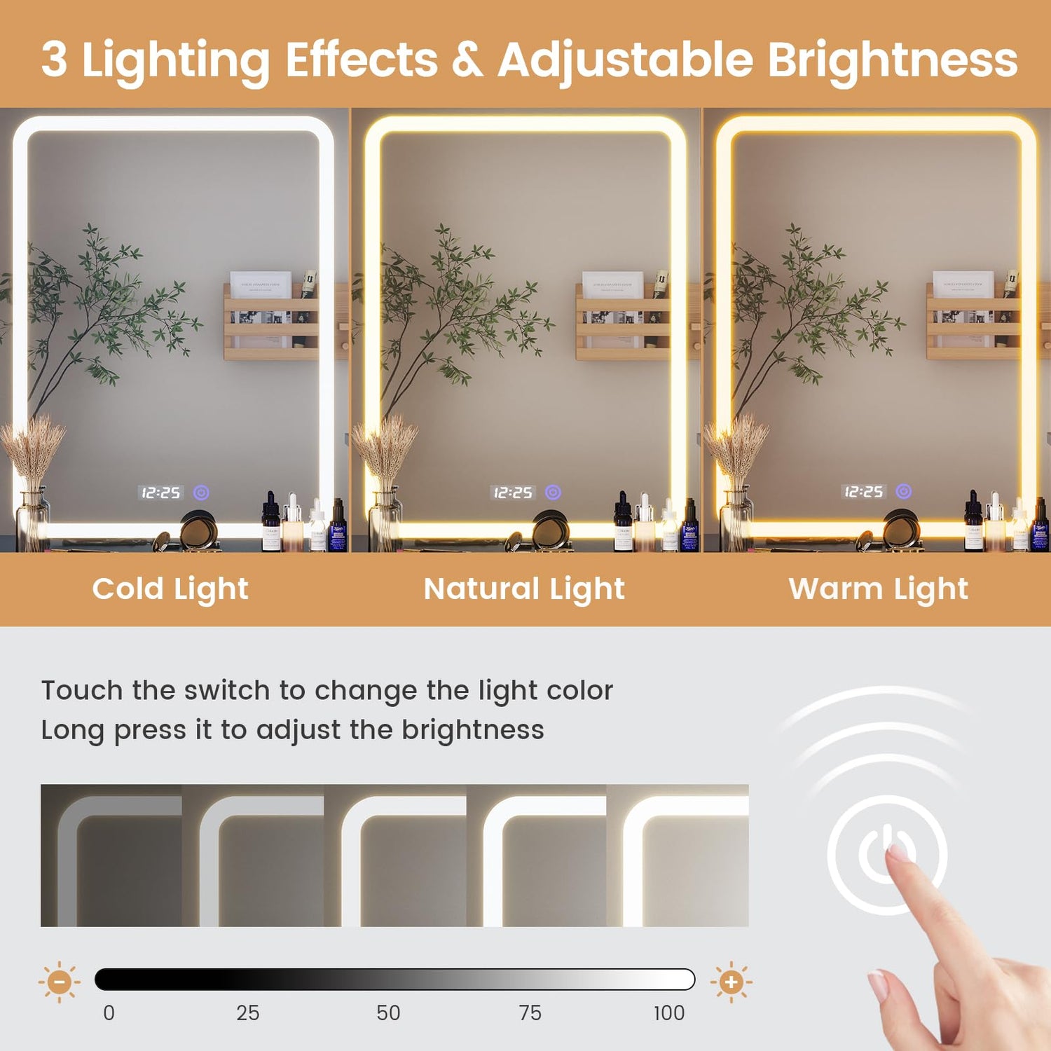 - 【Smart Mirror with Time Display】There is an LED display on the mirror, and the time is displayed on the display, so that you can easily know the time when you are putting on your makeup. Thus you can accurately grasp the time of your make-up and never be late again. The time can be adjusted and calibrated by the touch screen switch.