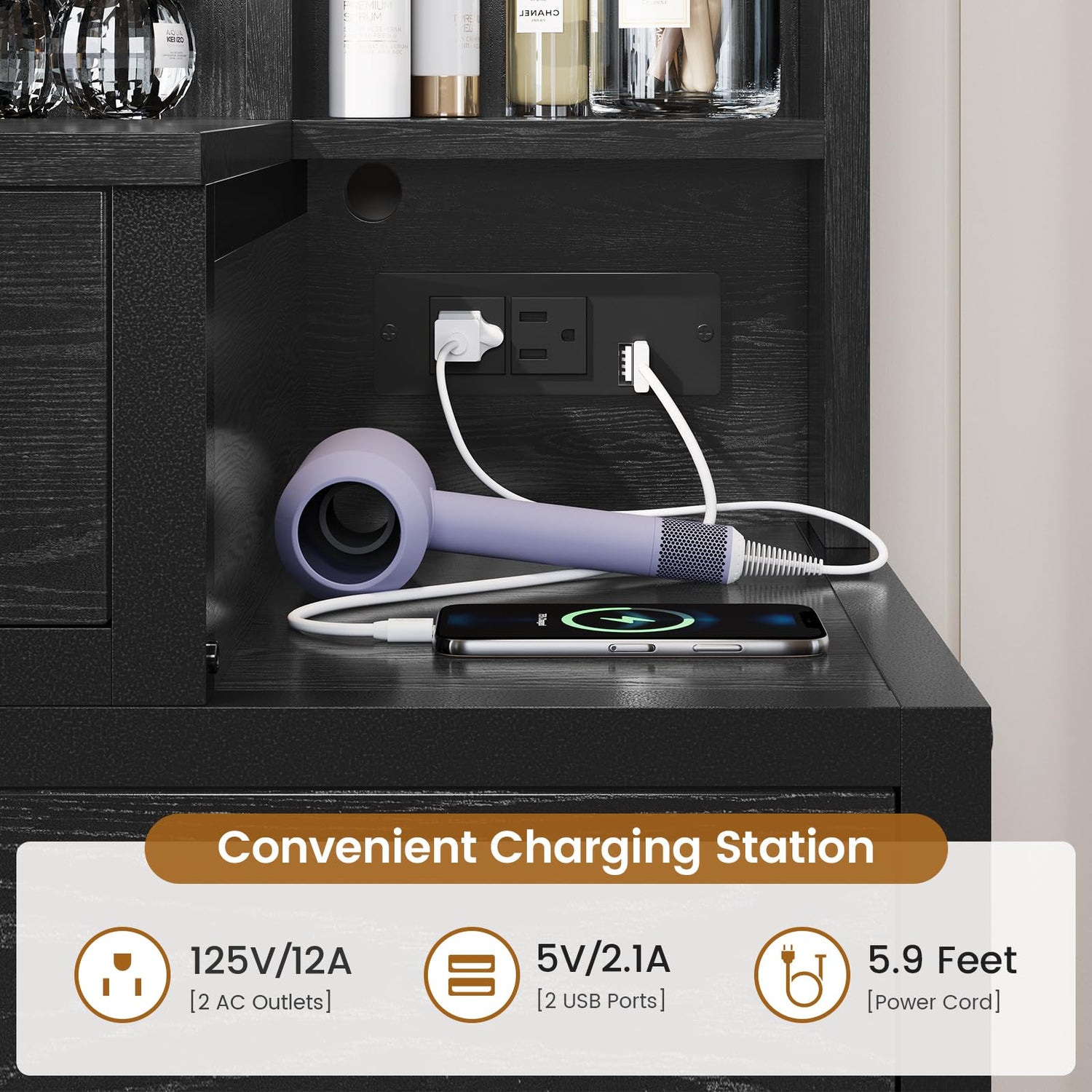 - 【Power Strip with USB Ports & Outlets】This vanity set has a built-in power strip above the 3-drawer cabinet, and the charging station contains 2 USB ports and 2 sockets for you to charge your electronics in time. And you can also sit directly in front of the dressing table to easily use the curling iron or hair dryer to style your hair.