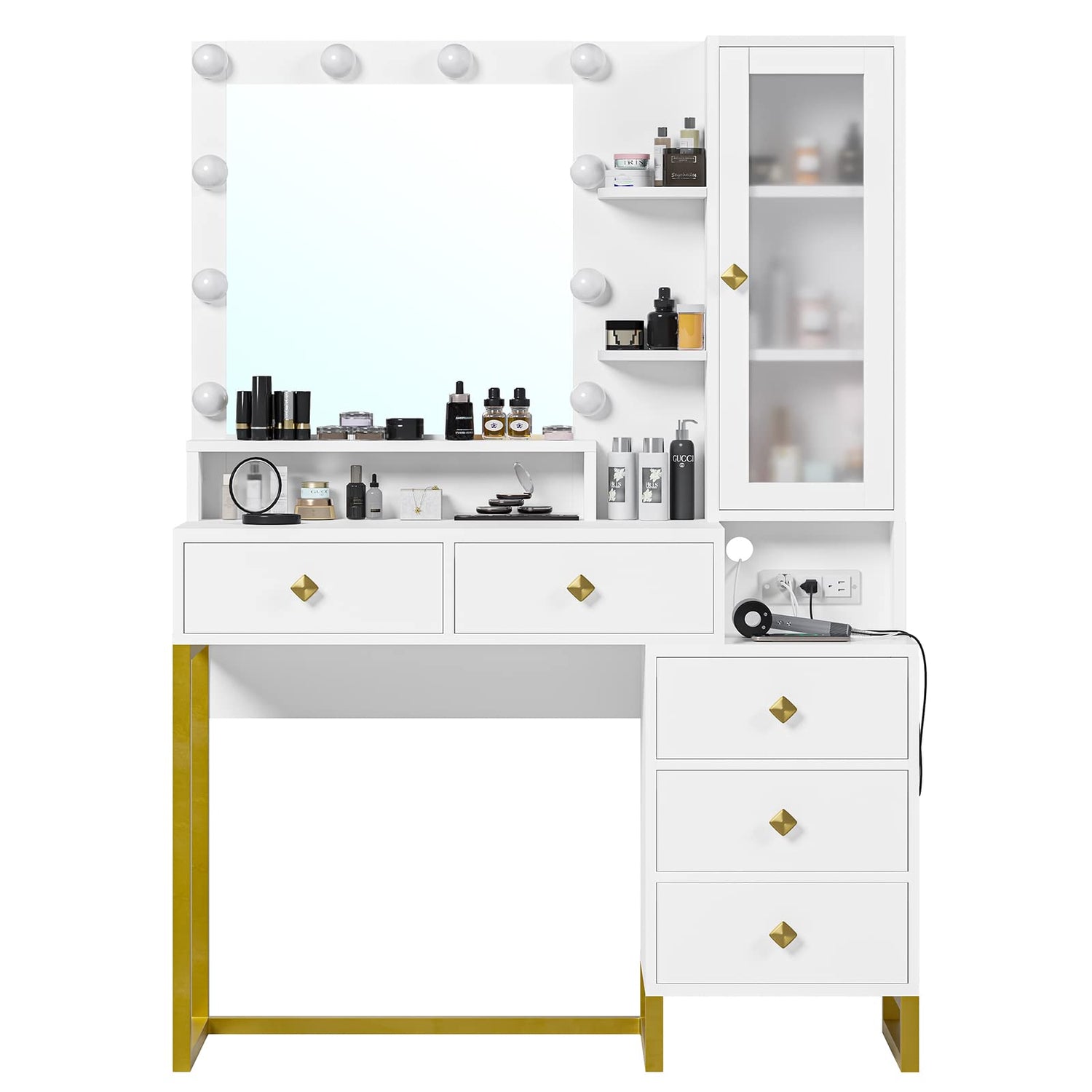 Tiptiper Makeup Vanity with Lights & Charging Station, Large Vanity Desk with Mirror and Lights, Makeup Table with 5 Drawers & Shelves, White and Gold