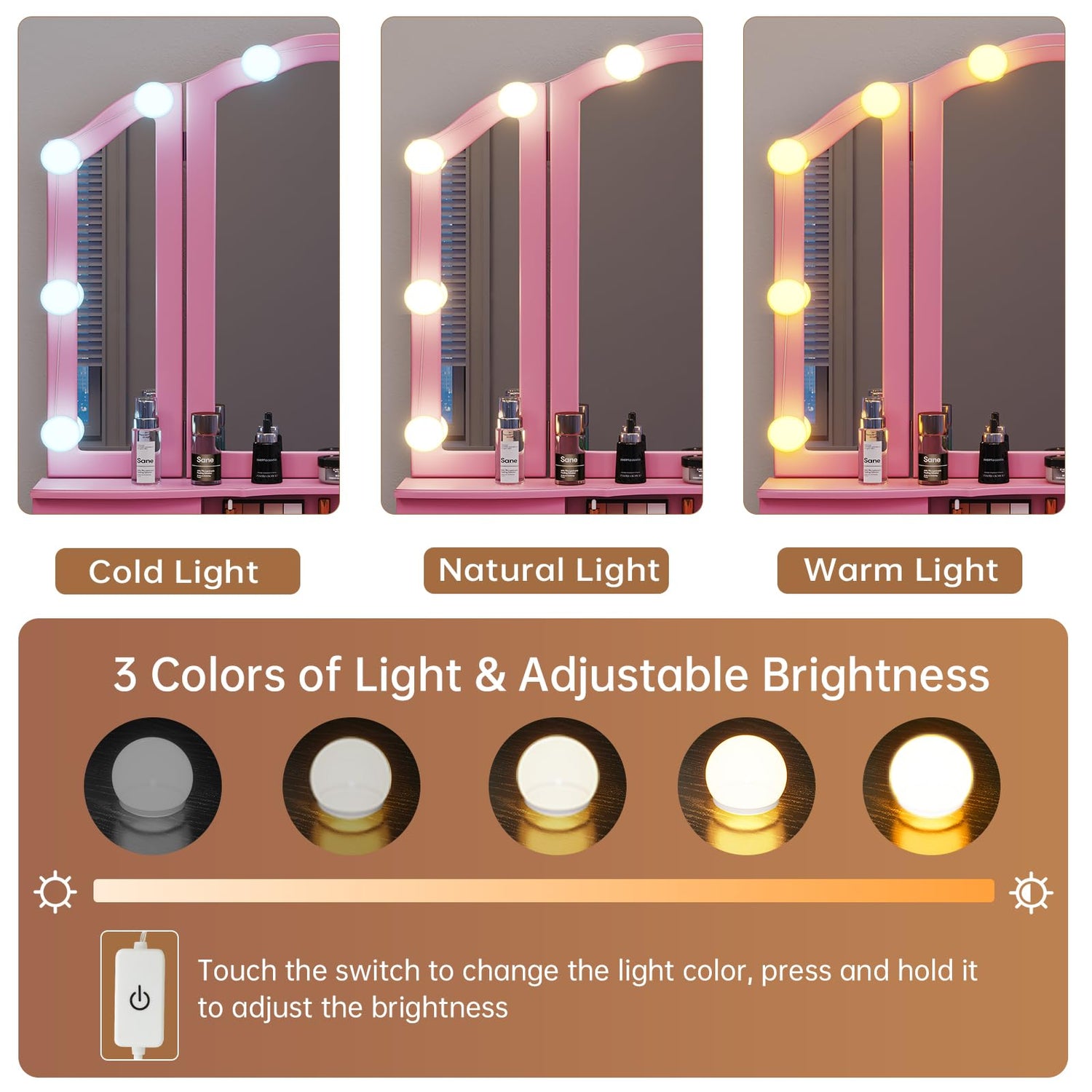 - 【10 LIGHT BULBS & 3 COLOR LIGHTING MODES】Vintage Yet Stylish, classic Tri-Folding Mirror with 10 Hollywood Style LED Bulbs. There are 3 lighting modes, touch the switch to adjust the modes: ①Warm Yellow - Suit for Night Makeup. ②Warm White - Suit for Indoor Makeup. ③Cold White - Suit for Daily Makeup. Allowing you to makeup in a variety of light conditions with soft and not dazzling light, it’s also a perfect place for yourself to escape and unwind after a long day.