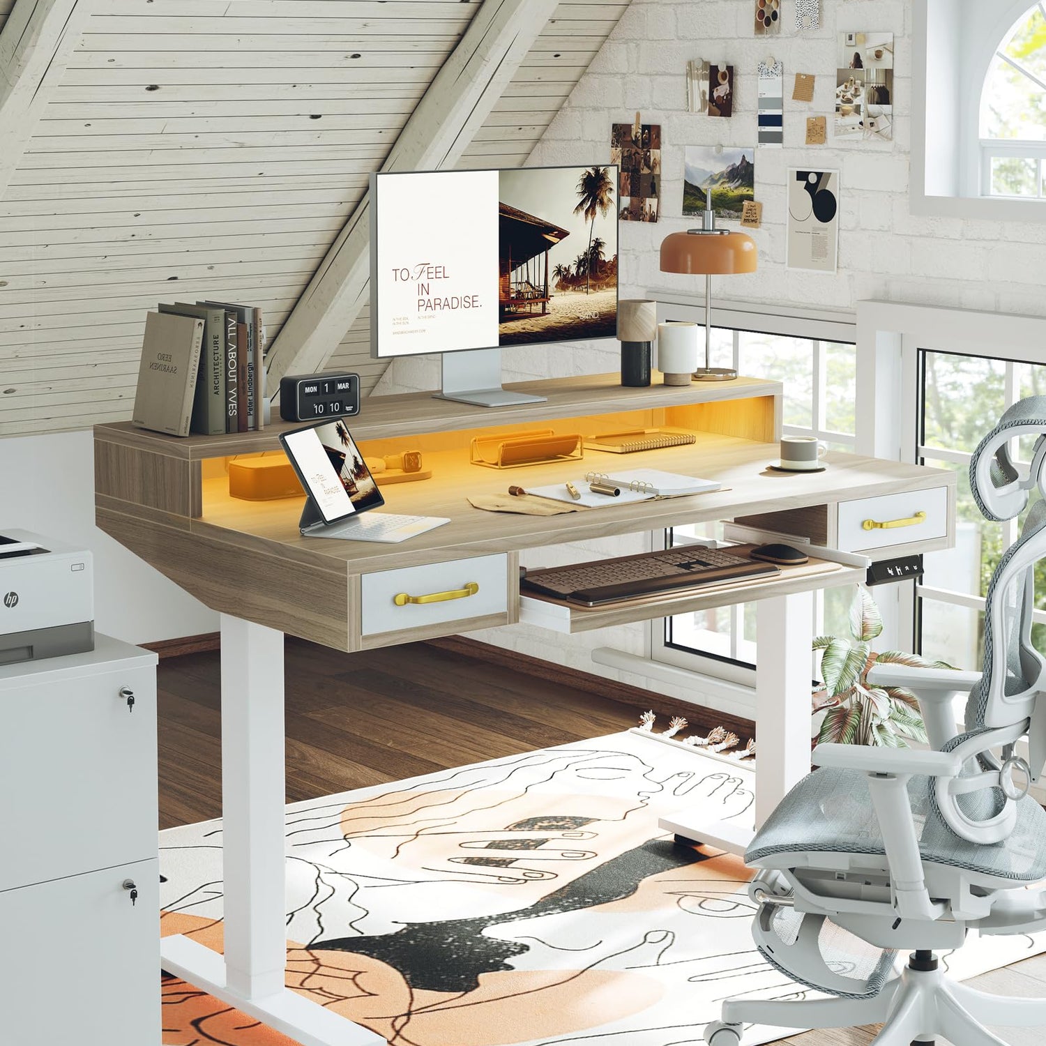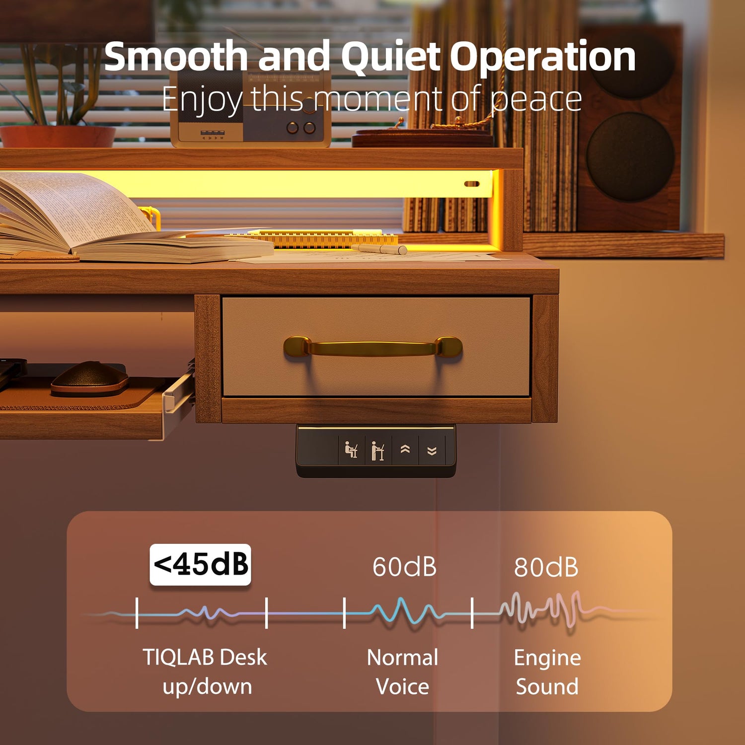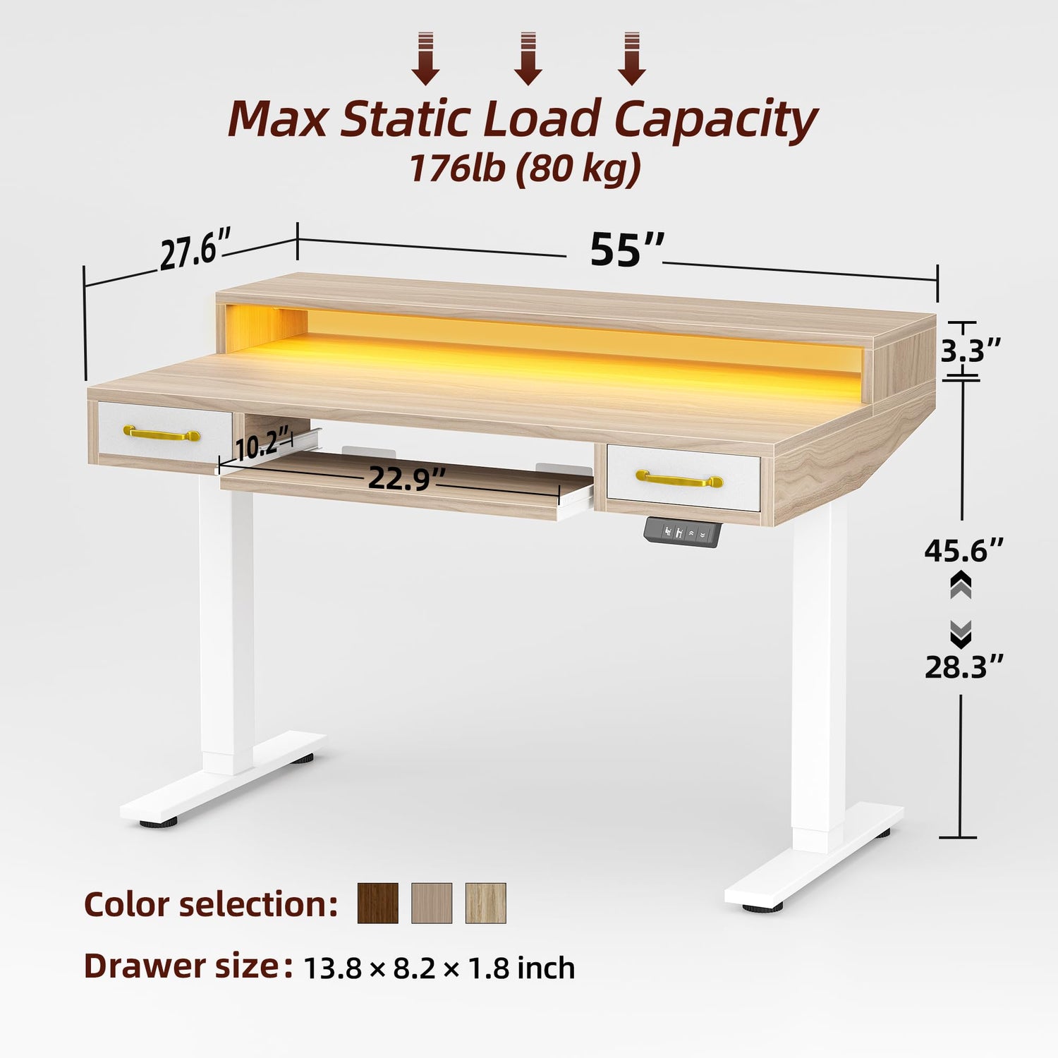 TIQLAB 55 x 28 Inch Height Adjustable Electric Standing Desk with Double Drawers&Keyboard Tray, Stand Up Desk with LED Strips&Monitor Stand, Light Walnut