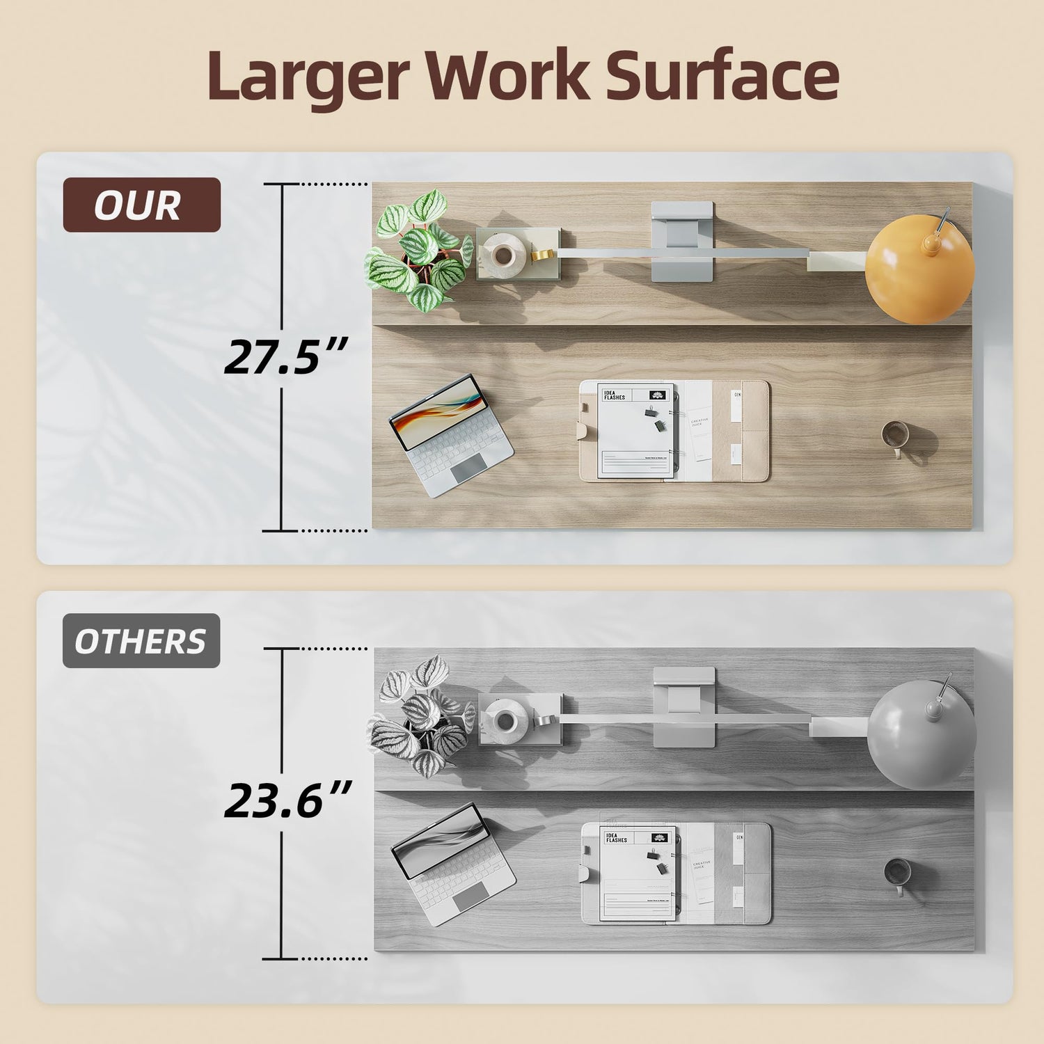 • Wider Desktop Design: Compared to standard standing desks, the extended desktop offers a more spacious and comfortable work environment.