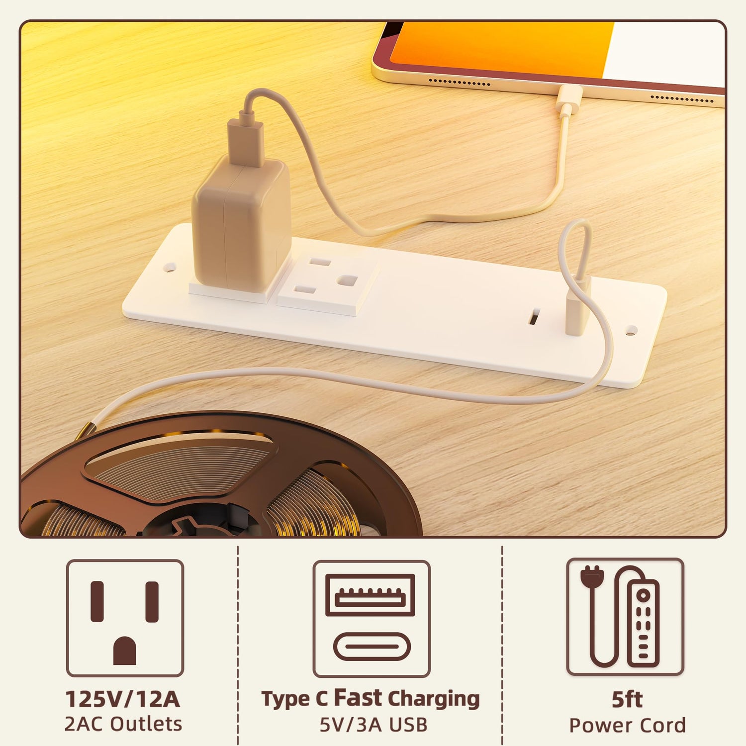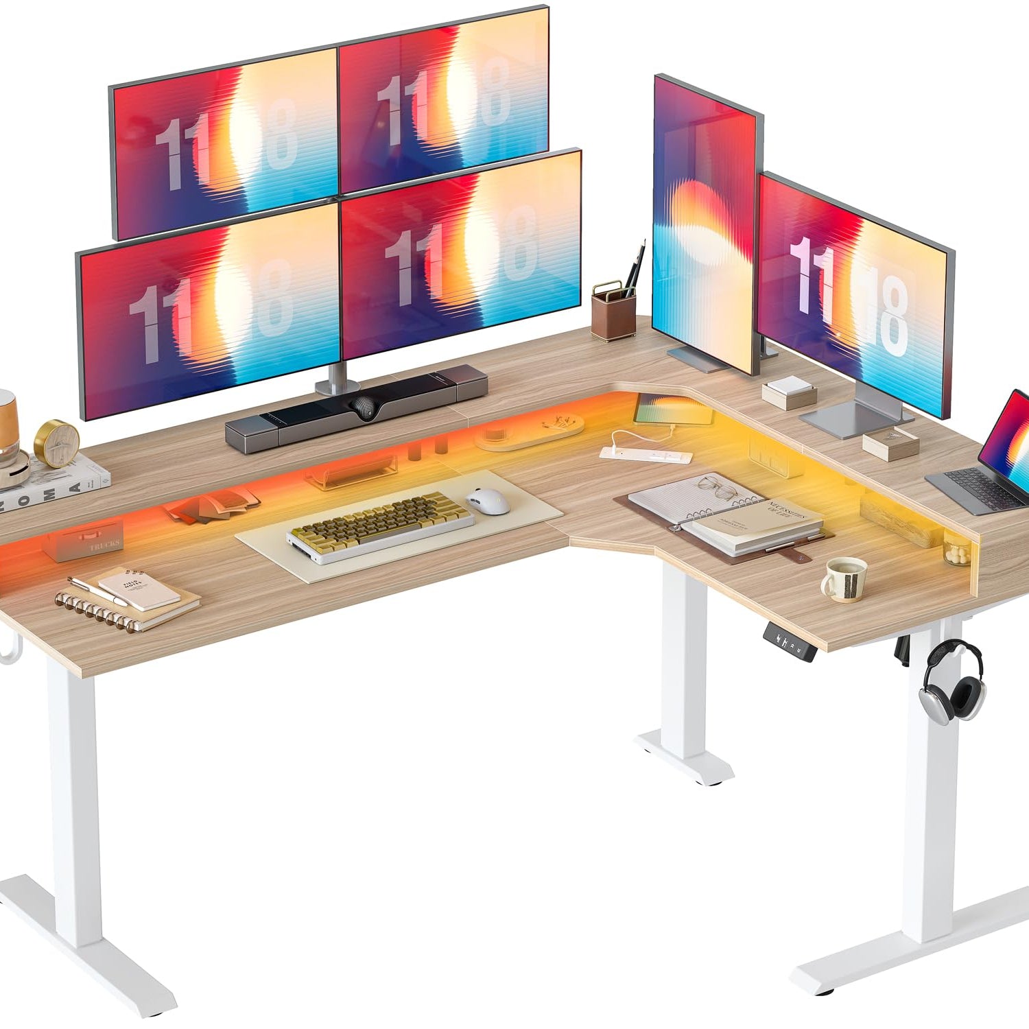 TIQLAB 63'' L-Shaped Standing Desk with LED Light Strip and Power Outlet, Height Adjustable Corner Table with Ergonomic Monitor Stand, Light Walnut