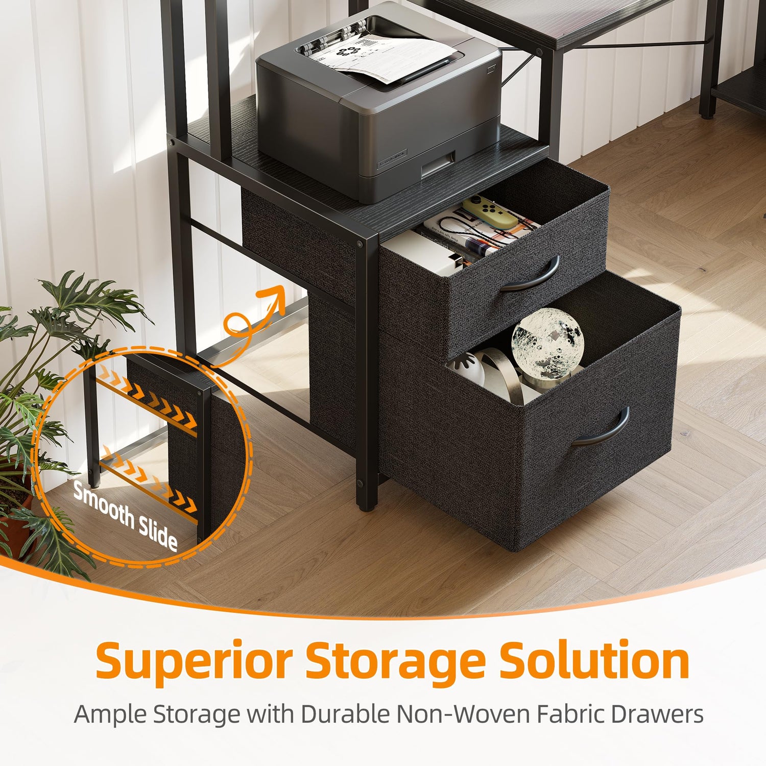 - Ergonomic Home Office Desk- Experience a new level of productivity with our versatile L-shaped Computer Desk. Featuring two expansive desktops and a long monitor stand, it easily accommodates dual monitors or laptops. The printer rack fits any standard printer size, while two fabric drawers keep essentials organized.