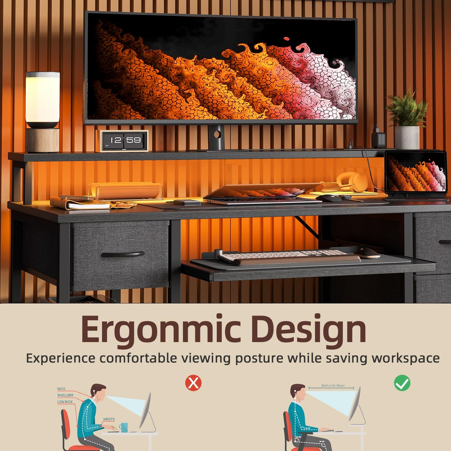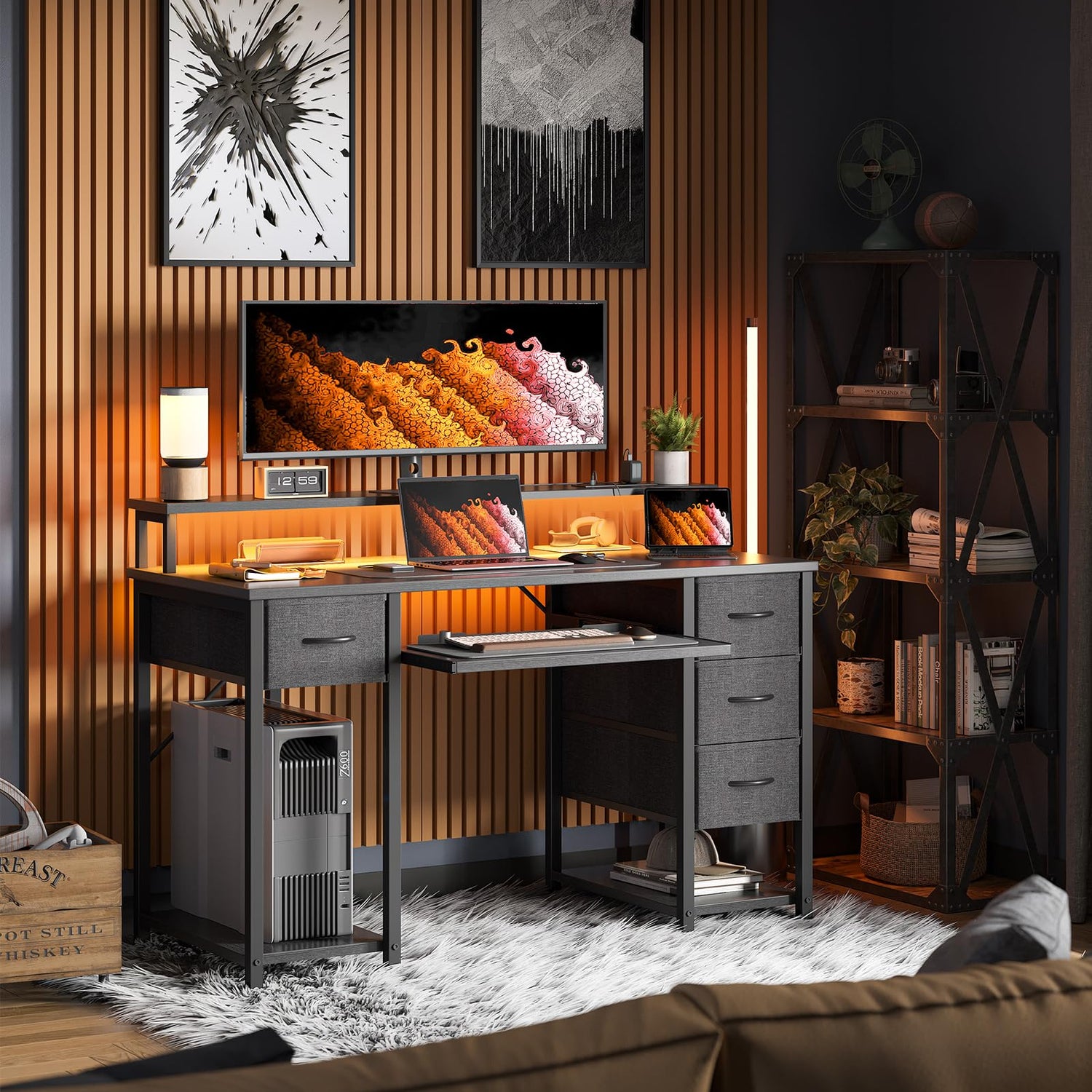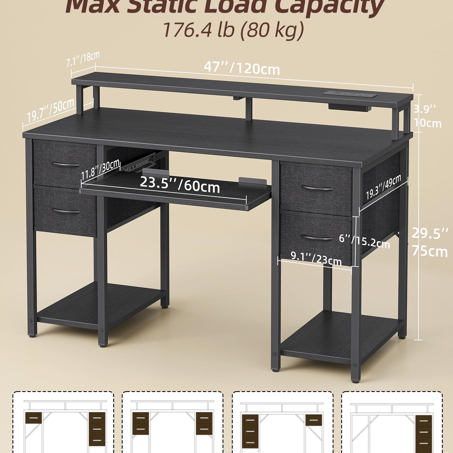 - Desk with Drawers and Shelves - The 47-inch Computer Desk features 4 fabric drawers and 2 shelves, making it a breeze to organize and clean your workspace. The keyboard tray provides ample space for your keyboard, ensuring a comfortable typing experience and maximizing your workspace.