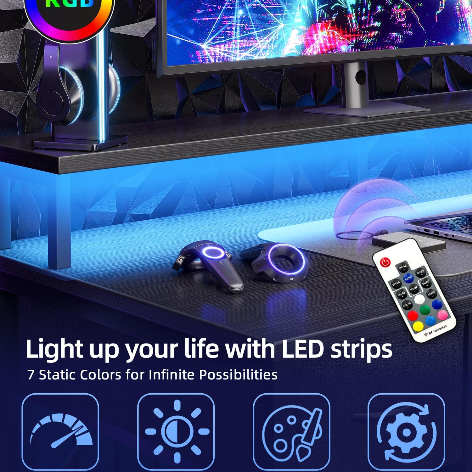 - Gaming Desk with LED Lights - Desk with LED lights create an immersive gaming ambiance with 20 colors, 22 modes, 5 adjustable brightness levels, and 10 flicker frequencies, making your gaming experience even more enjoyable.
