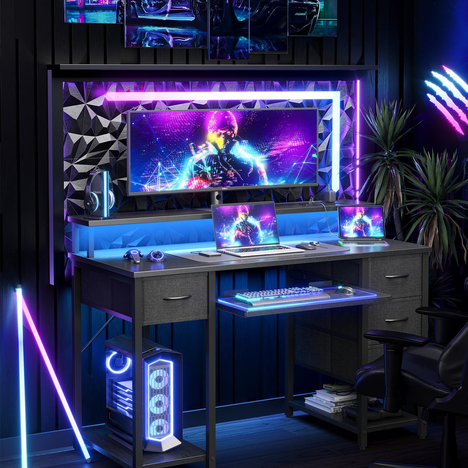 TIQLAB Computer Desk with Drawers and Power Outlets, 47 Inch Gaming Desk with LED Lights, Home Office Desk with Monitor Stand and Keyboard Tray, Study Writing Work Desk for Home Office, Black