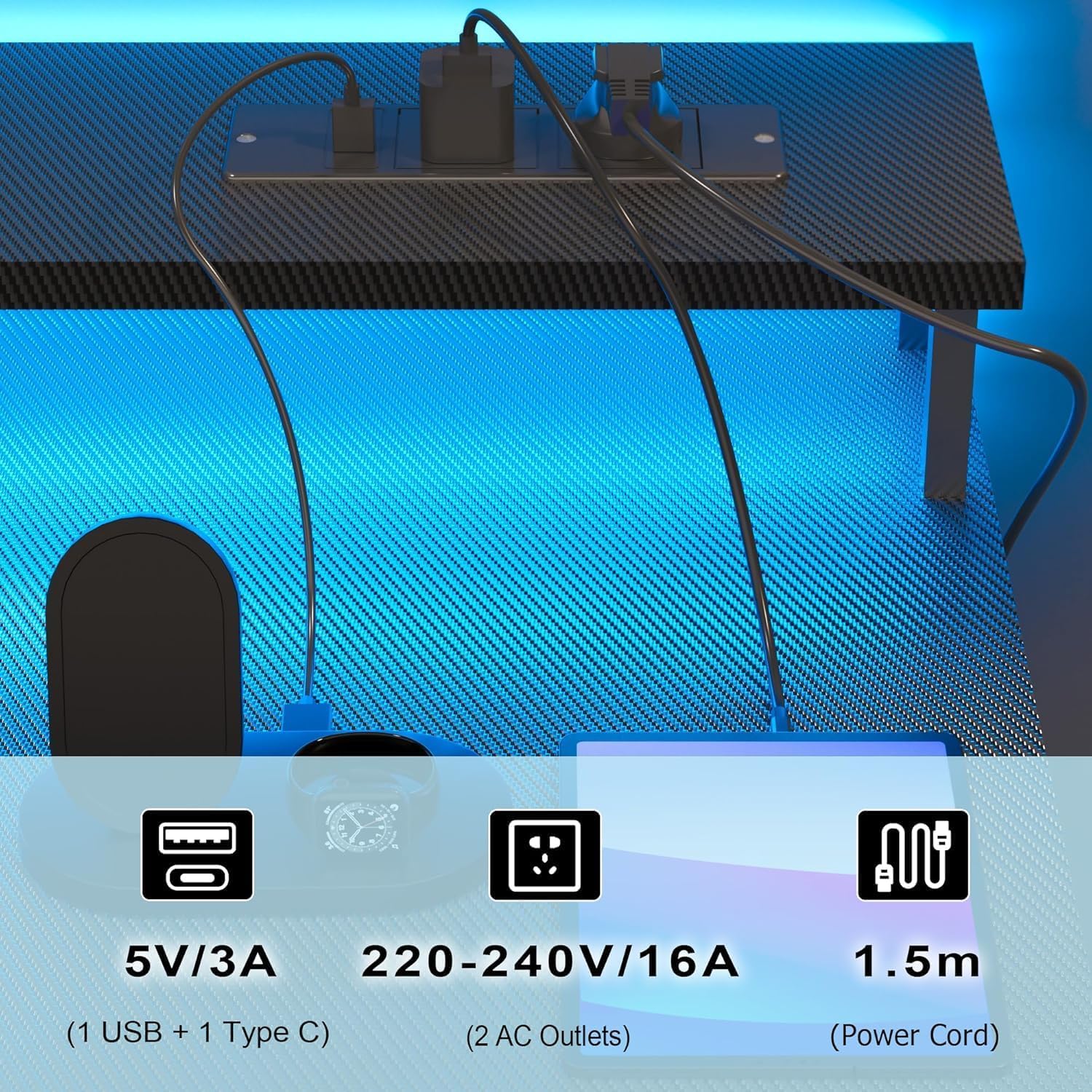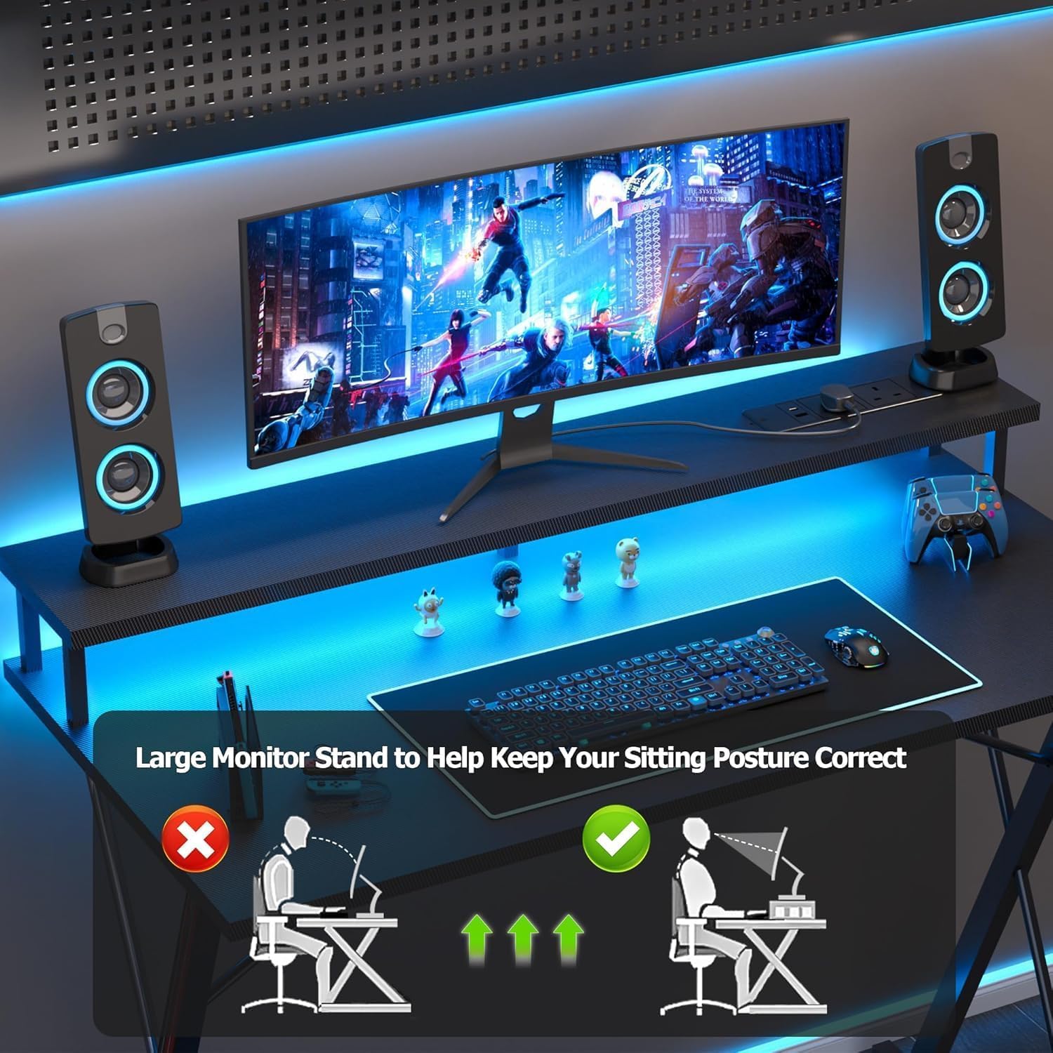 TIQLAB Gaming Desk with Power Outlets & LED 47 Inch Ergonomic Computer Carbon Fiber Surface Gamer Desk, Large Monitor Stand, Headphone Hook, PC Workstation for Bedroom, Black Desk
