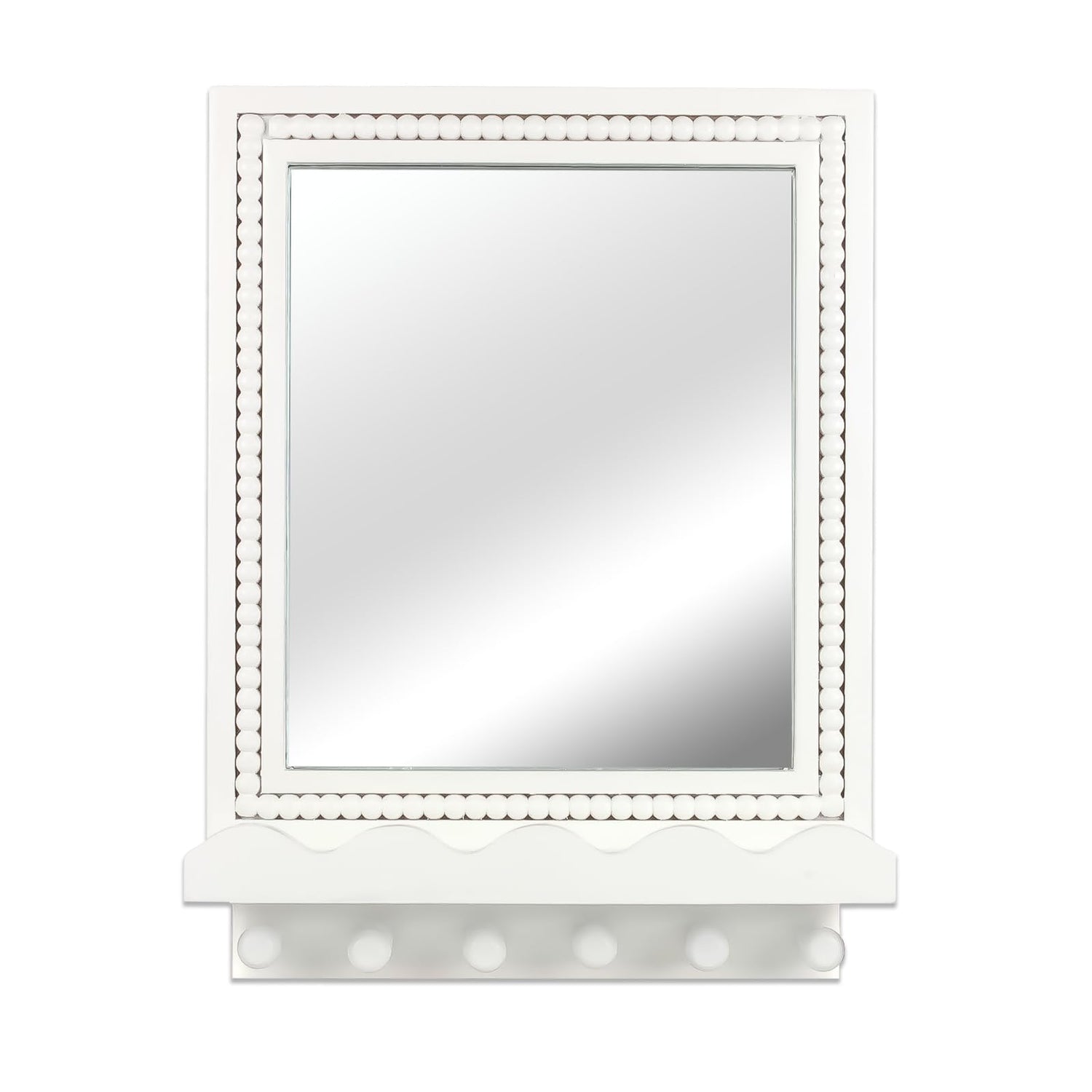 Tirzah 16x12 Inch Wall Mount Beaded Wood Framed Mirror with Shelf and 6 Hooks, White Decorative Entryway Mirror with Storage for Laundry Room, Bathroom, Bedroom
