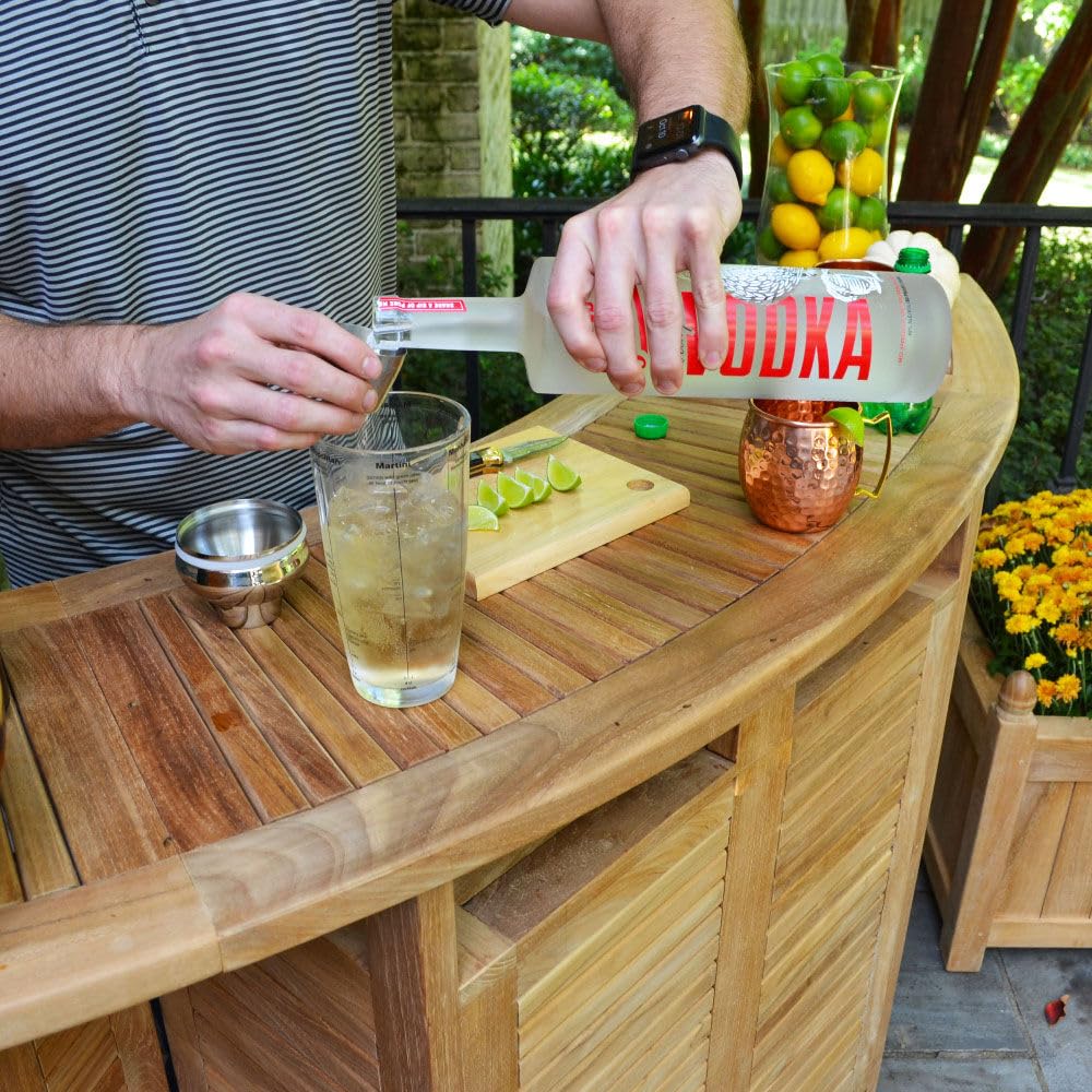 Teak wood is naturally weather resistant and is one of the few woods in the world containing a natural oil which repels water. We utilize solid brass hardware and wooden dowels for all of the connection points to maintain the natural integrity and water resistance of your Teak furniture over time. Shake up your backyard, porch, or patio with a Titan Teak Bar Cabinet!