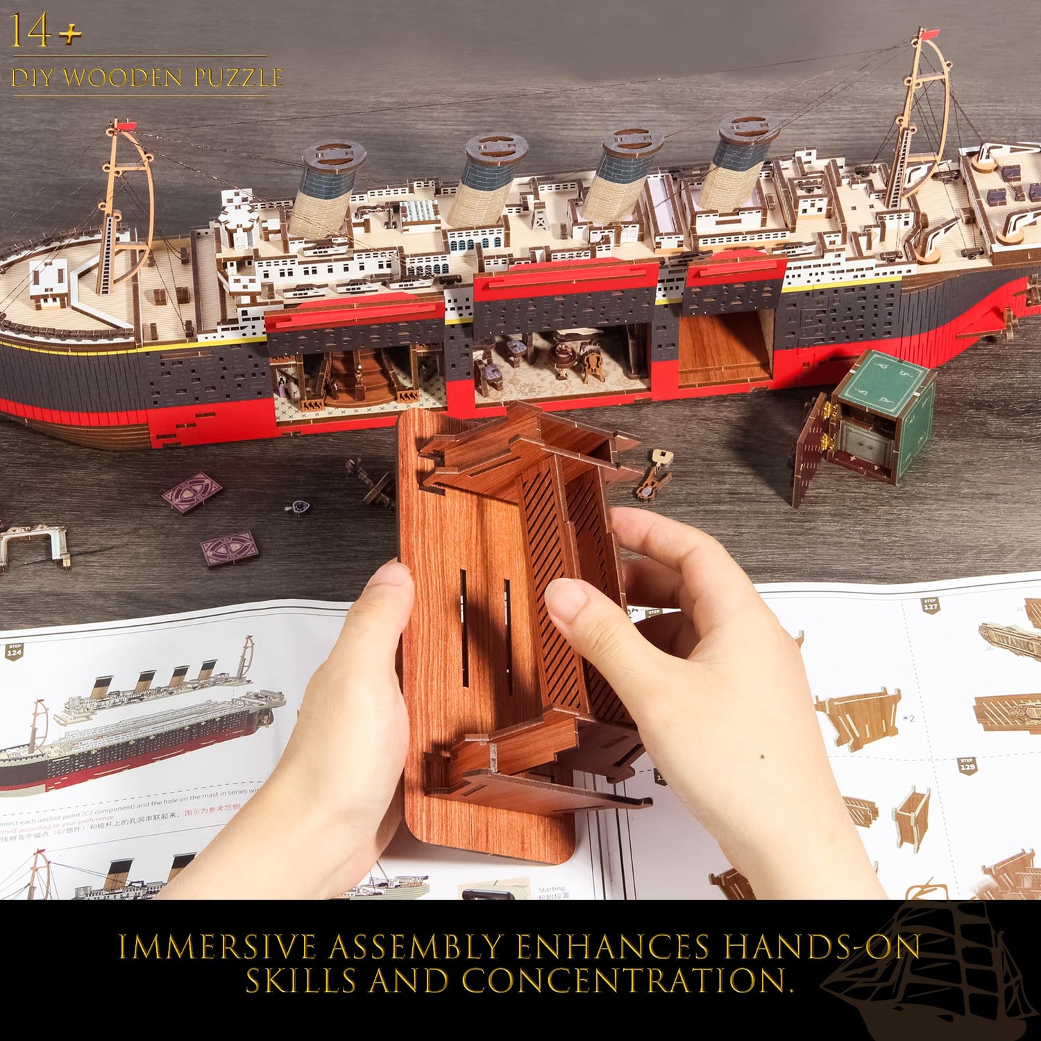 - Recreate Classic Moments: The wooden puzzles carefully reproduces the three classic scenes in the movie, the ballroom, Rose's room, and the safe where the Heart of the Ocean is placed. At 19.68*6.69*2.95 inches, this Titanic model takes you on a journey through time, let you to experience the legendary lives of its characters!