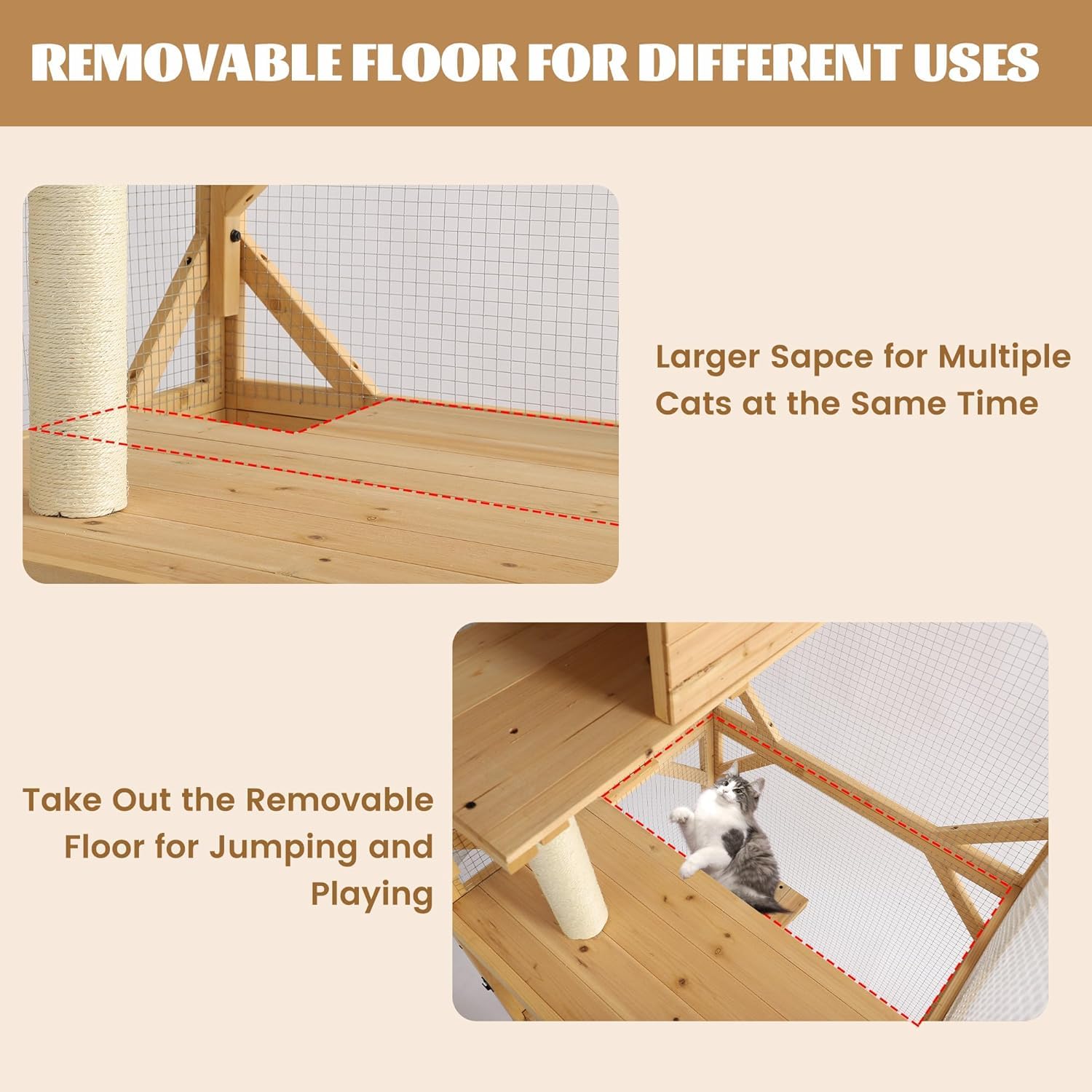 - Spacious Space: Our wooden outdoor cat house provides a spacious and comfortable home for 2-3 cats. It includes 2 jumping platforms, 1 resting box, 1 removable tier, lockable gate and 2 small doors each, giving your furry friend more room to jump and play