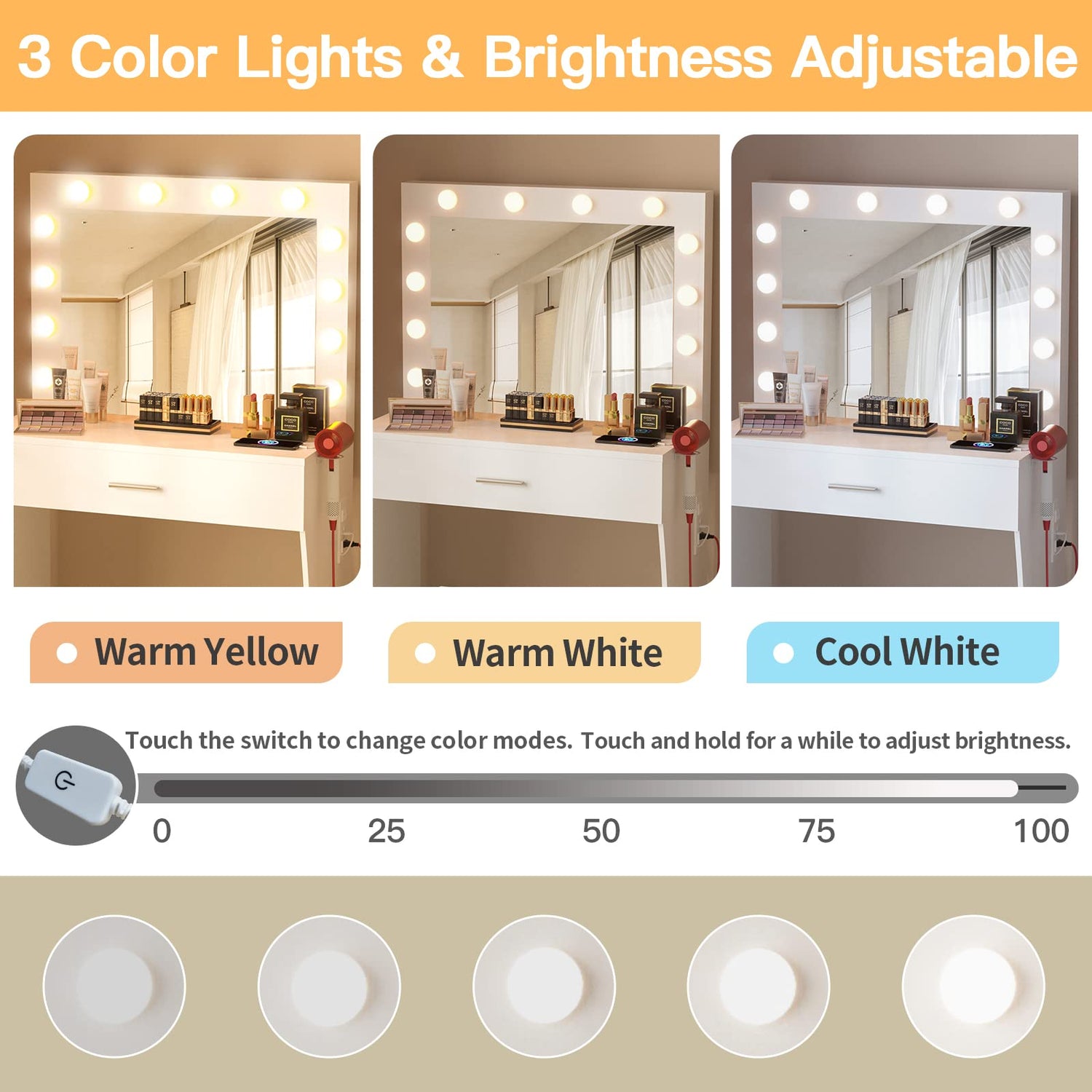 - 【Large Mirror with 12 LED Bulbs】More bright, soft & adjustable lights, let this beauty station start a nice day for you. 3 colors lighting modes for your option,cold white/ nature/ warm, you can freely adjust the color and brightness.