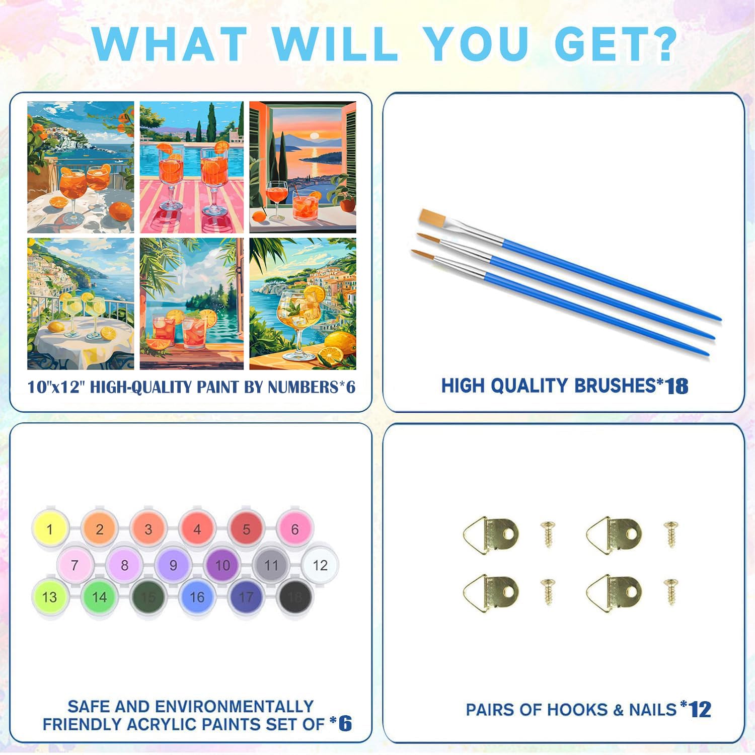 - 【Paint By Numbers Kit For Adults】Acrylic DIY paint by number for adults has a complete tool kit, including 18*nylon brushes, 12*hook nails, 6*matched Acrylic paint and 6*HD Canvas. Open the package and you can start painting immediatelyat. we will provide you with everything you need to paint.