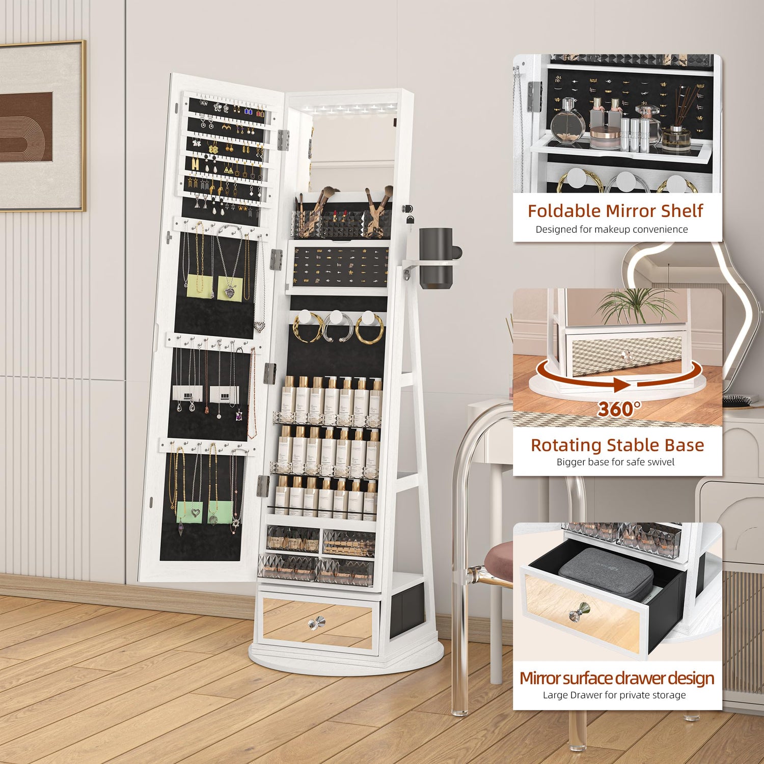 Details: TJYGO 360° Swivel Jewelry Cabinet with Mirror, 6 LED Lights, Rotatable Full Length Mirror with Jewelry Storage Shelf, Standing Jewelry Armoire Organizer, Foldable Makeup Shelf