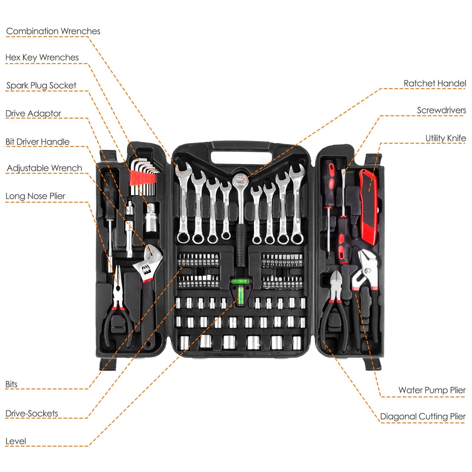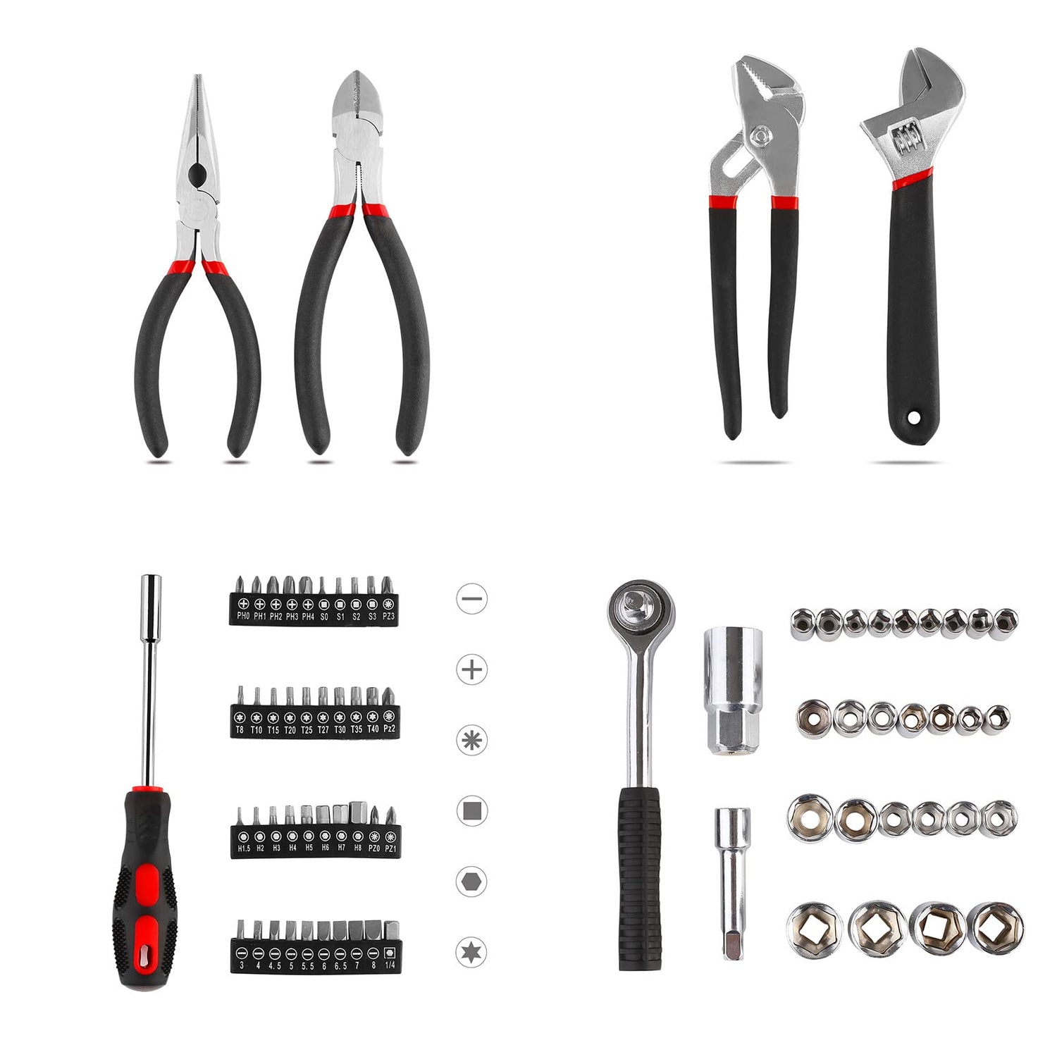 - Include utility knife, water pump plier, screwdrivers, diagonal cutting plier, combination wrenches, ratchet handle, level, bits, hex key wrenches, spark plug socket, drive Adaptor, drive extension bar, bit driver handle, adjustable wrench, ong nose plier, drive-sockets.