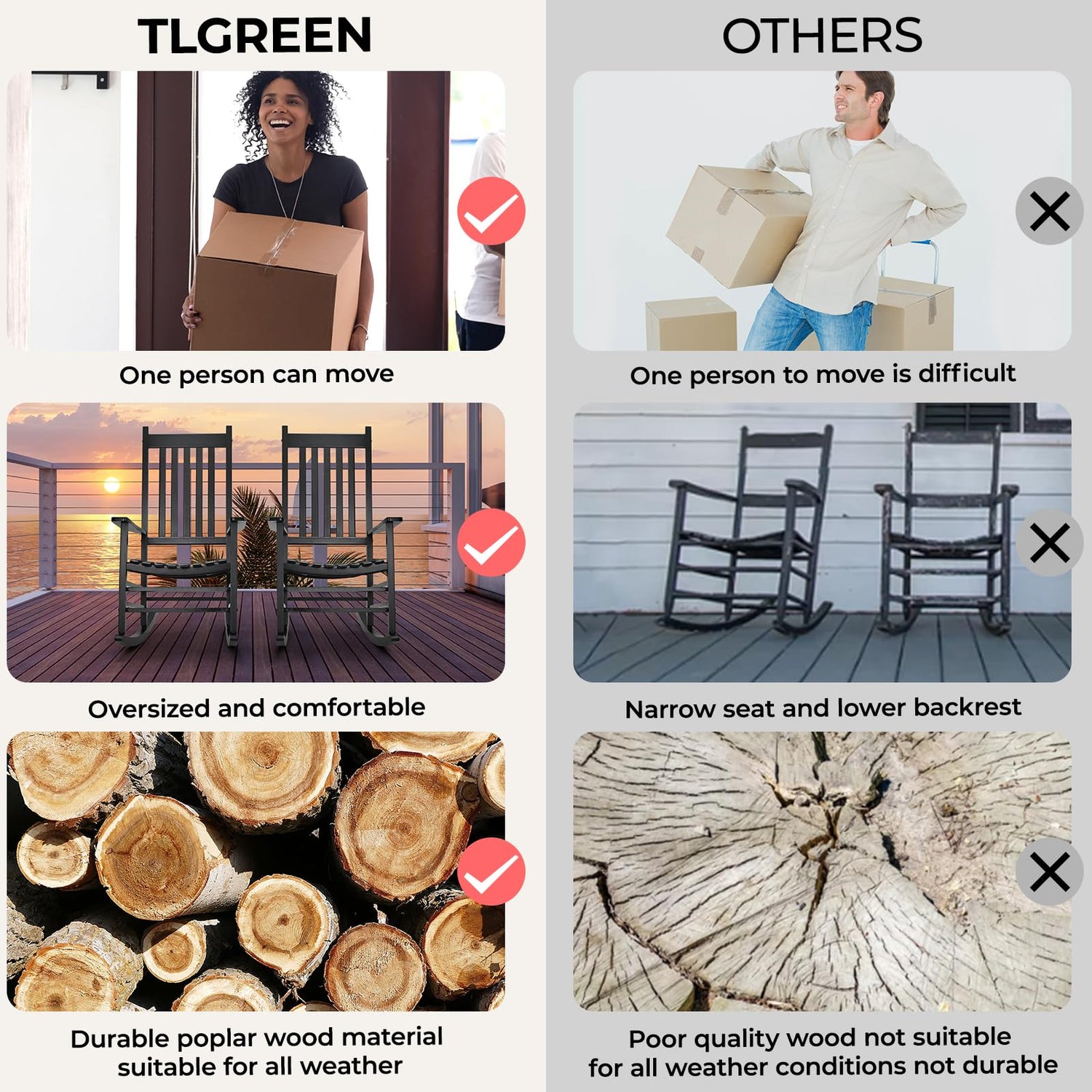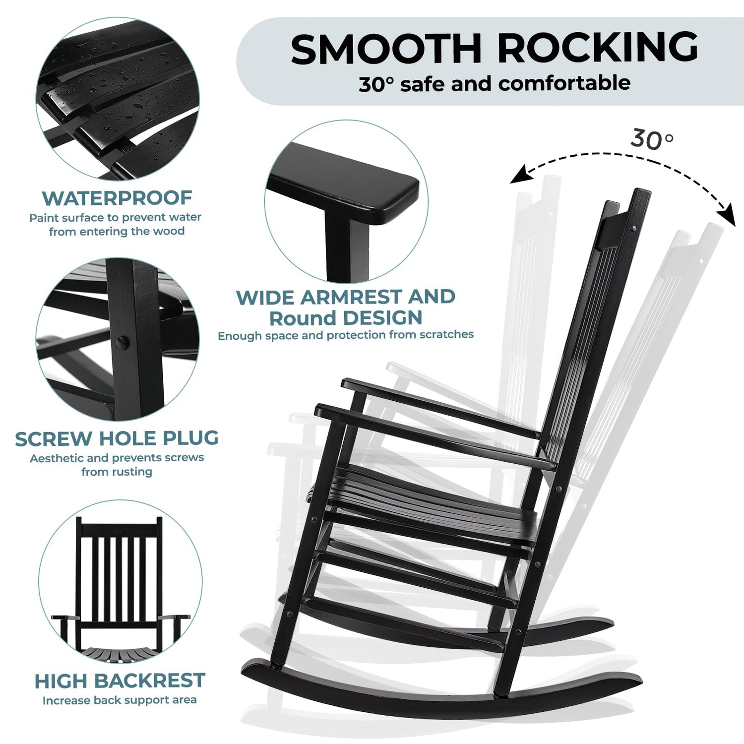 - 【High Quality Solid Wood】Our patio rocking chairs are made of poplar wood with a good lacquer finish. Provide effective waterproof protection.Structurally stable and lighter than plastic materials, but not easy to tip over. Our black rocking chair can be used all year round without worrying about fading and water ingress.