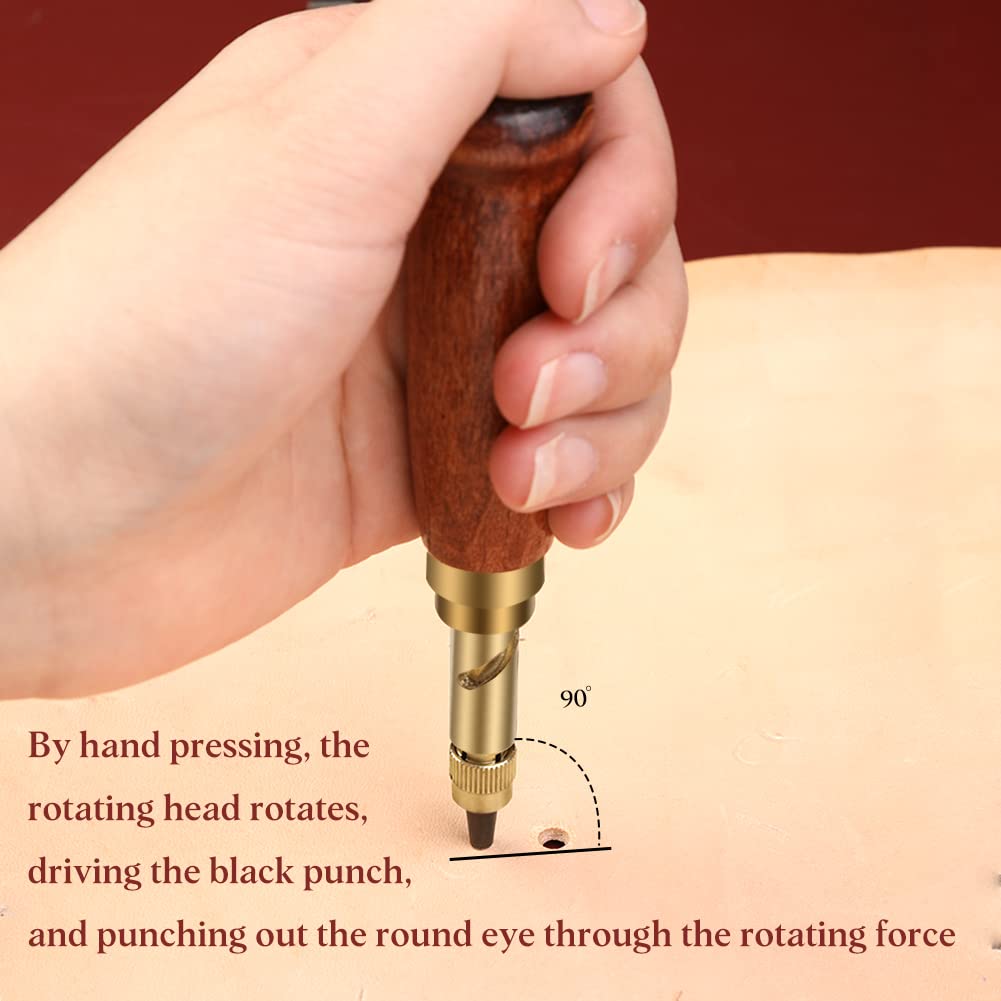 TLKKUE Adjustable Leather Hole Punching Tool Automatic Puncher with Wooden Handle Hollow Hole Punch with 6 Tips Size (1.5mm/2mm/2.5mm/3mm/3.5mm/4mm) for Leather Belt, Bag, Wristband