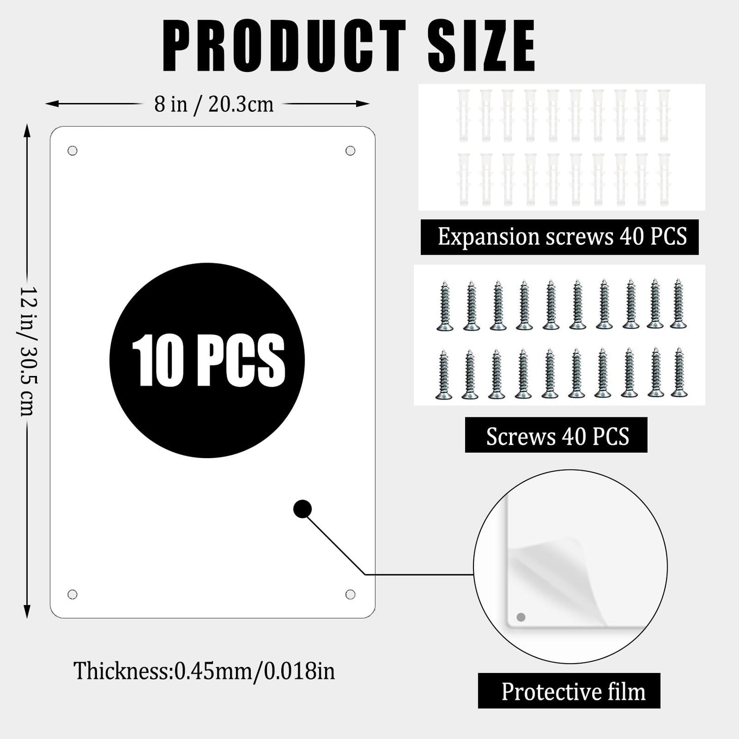 - 【Product Includes】You will get 10 pcs sublimation metal blanks with pre-drilled holes, suitable for heat transferring signs or photos once you peel off the protective film. Each aluminium sublimation sign blanks measures 8x12 inches and is 0.45 mm/0.018 inches thick. For easy installation, we also provide 40 expansion plugs with screws for hanging the sign