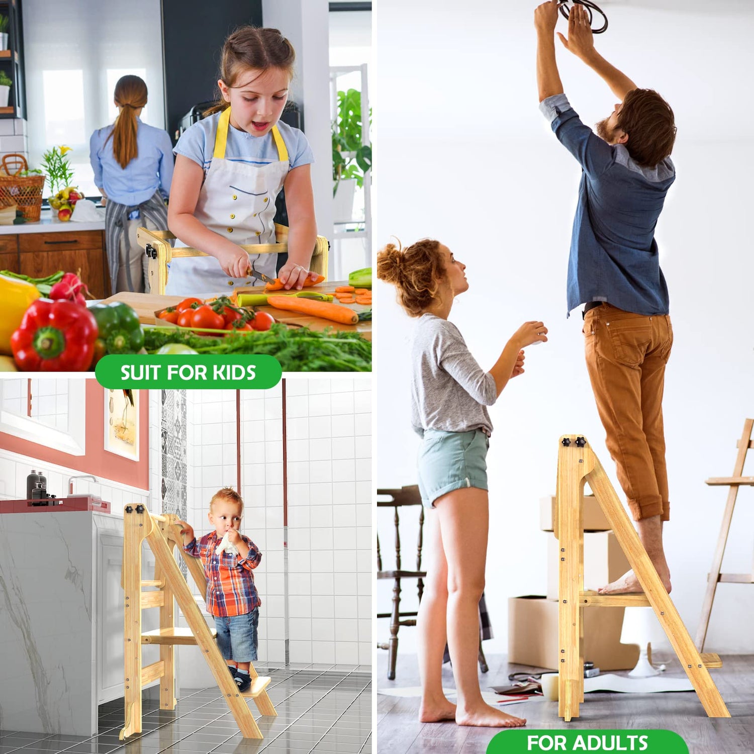 - 【Safe and Stable Structure & Multi-Functional Use】: Toddler Stool are composed of four wooden legs, safety pedals, anti-tilt angle plates, and safety railings. The structure is stable and does not shake. The loading capacity of toddler step stool is up to 176LB. With versatile use, your child will feel confident, independent, and safe when preparing food in the kitchen, brushing their teeth in the bathroom, dining in the restaurant, and climbing independently