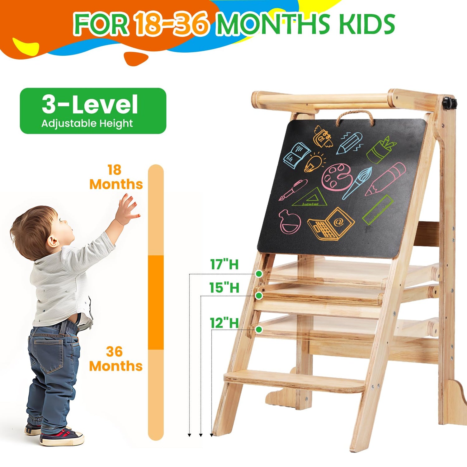 Toddler Tower Foldable - Kids Kitchen Step Stool with 3 Adjustable Heights & Safety Rail, Montessori Tower with Chalkboard for Learning, Standing Tower Helper Stool for Kitchen Counter Sink (Natural)