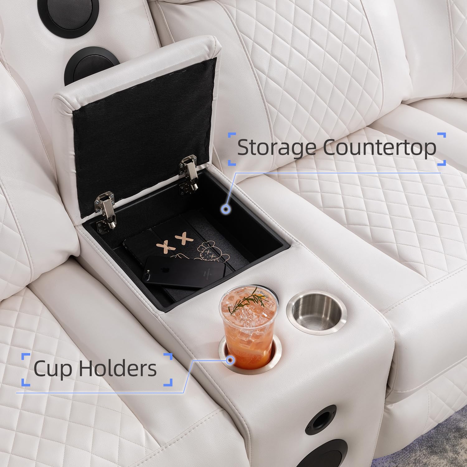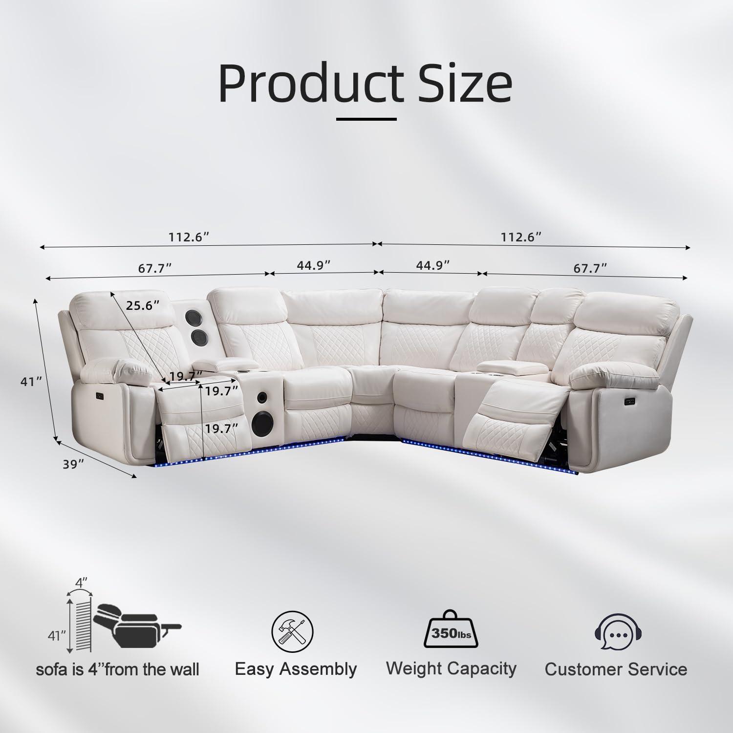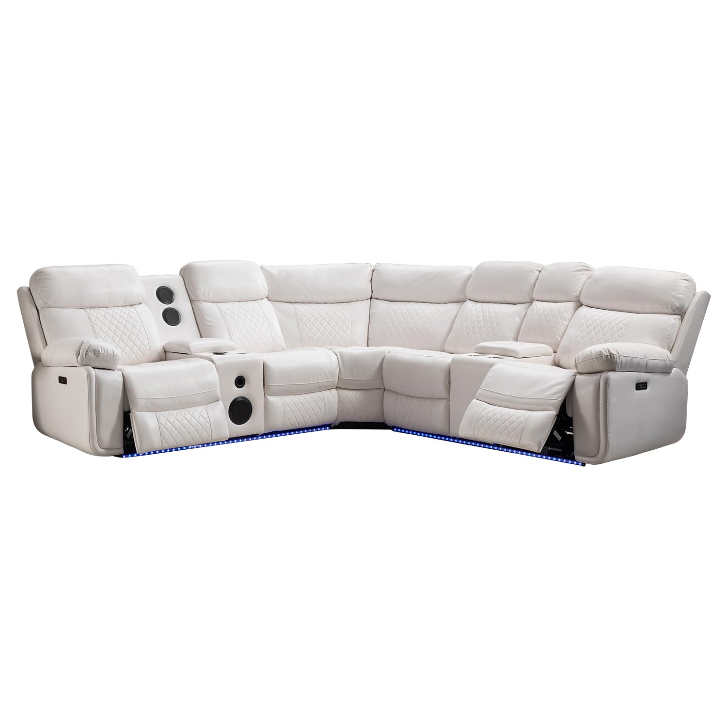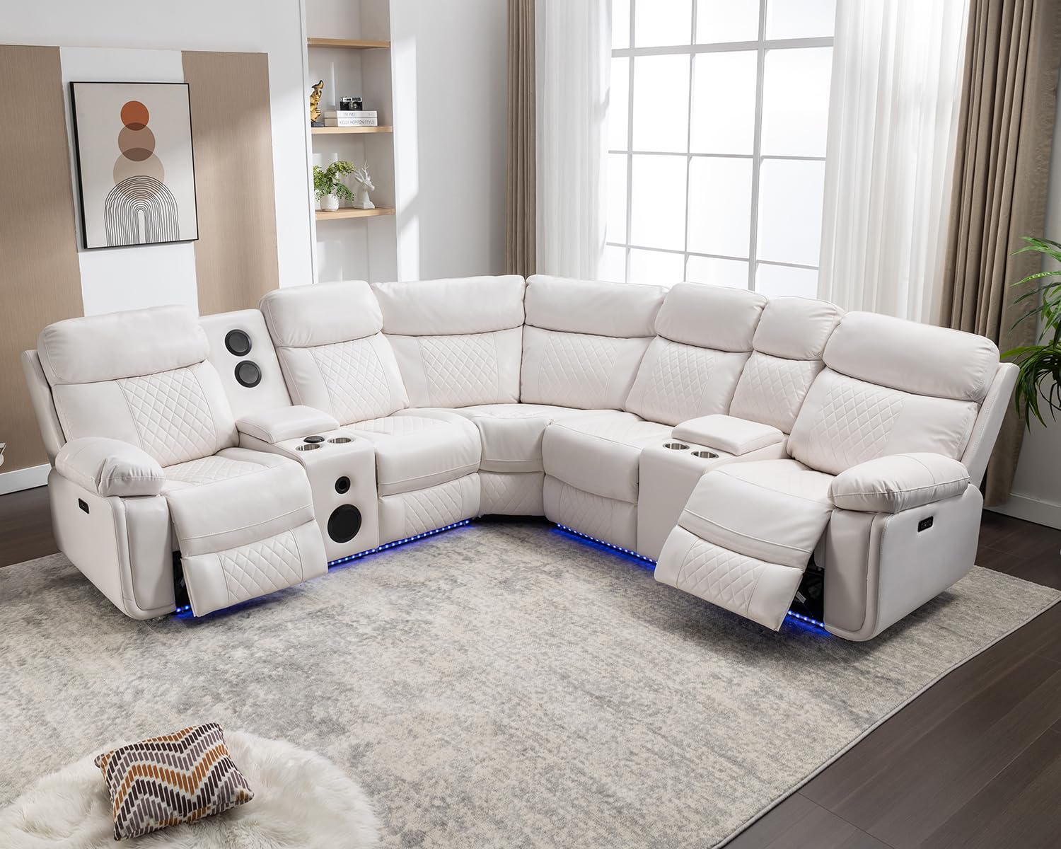TODRANI Power Sectional Reclining Sofa with Bass Speaker, Faux Leather Recliner Corner Couches with USB Ports, Modern Recliner Sofa for Living Room with LED Lighting, White