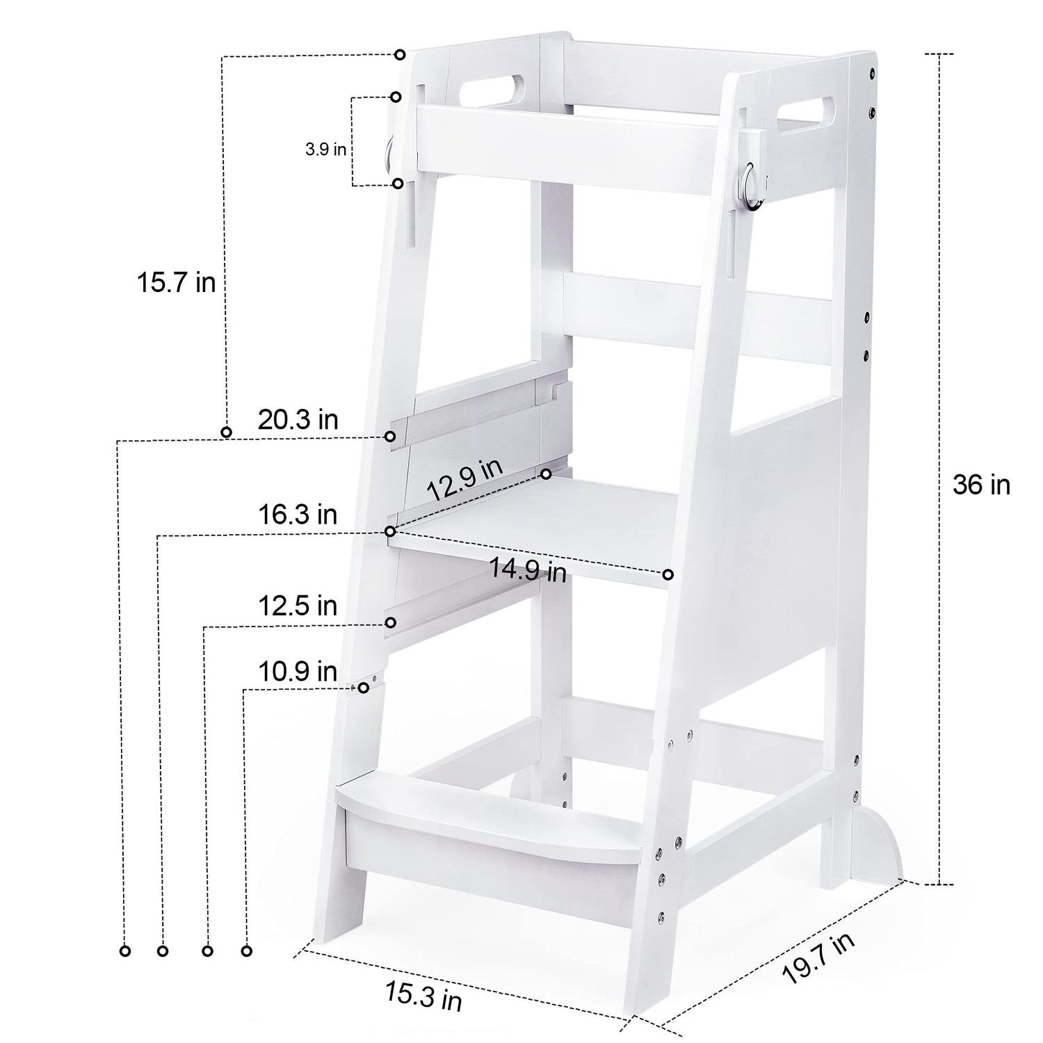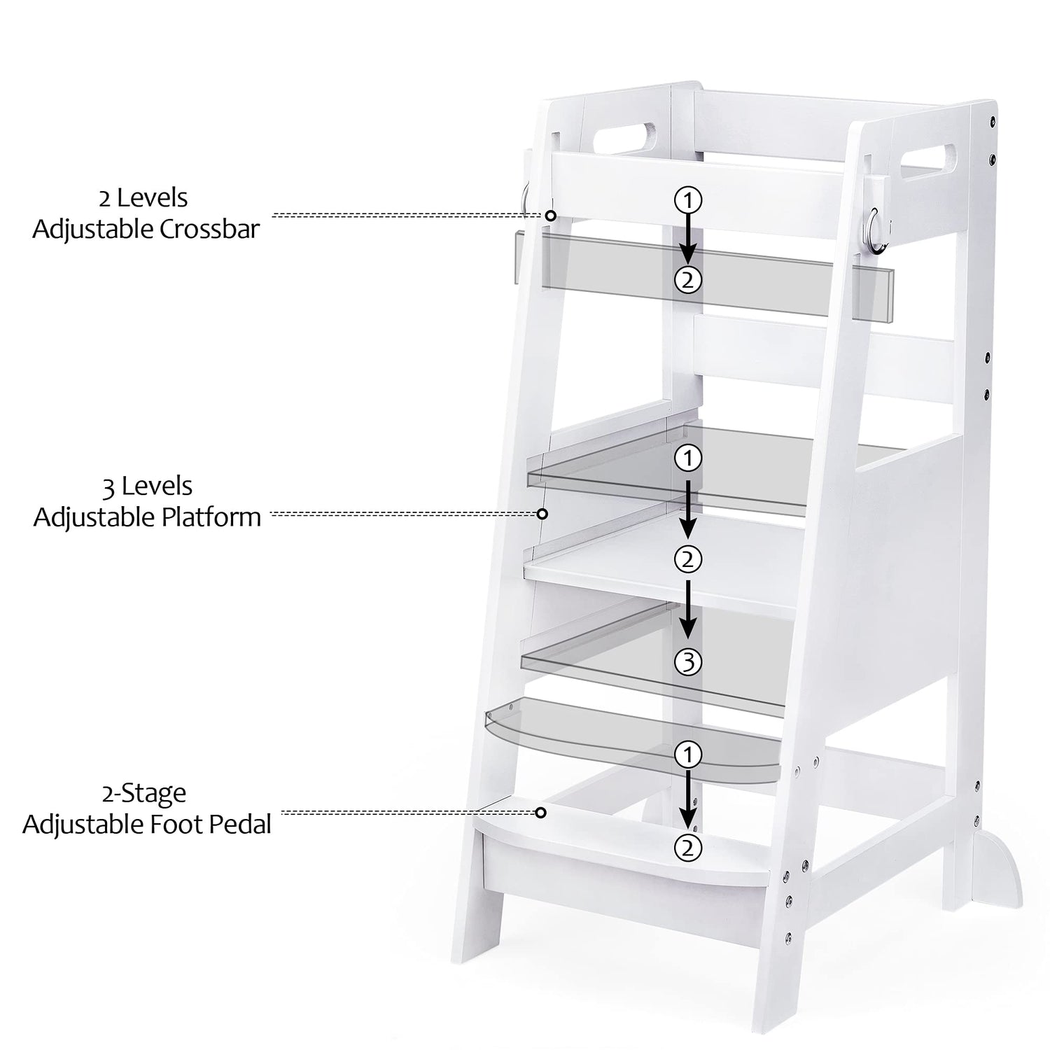 - HEIGHT ADJUSTABLE DESIGN: This toddler kitchen stool suitable for kids over 18 months. 3 levels adjustable platform and 2-stage adjustable foot pedal allow to get the perfect height for children of any age, which could witness your kids growth. 2 levels adjustable crossbar with rings can meet the needs of children sitting and standing.