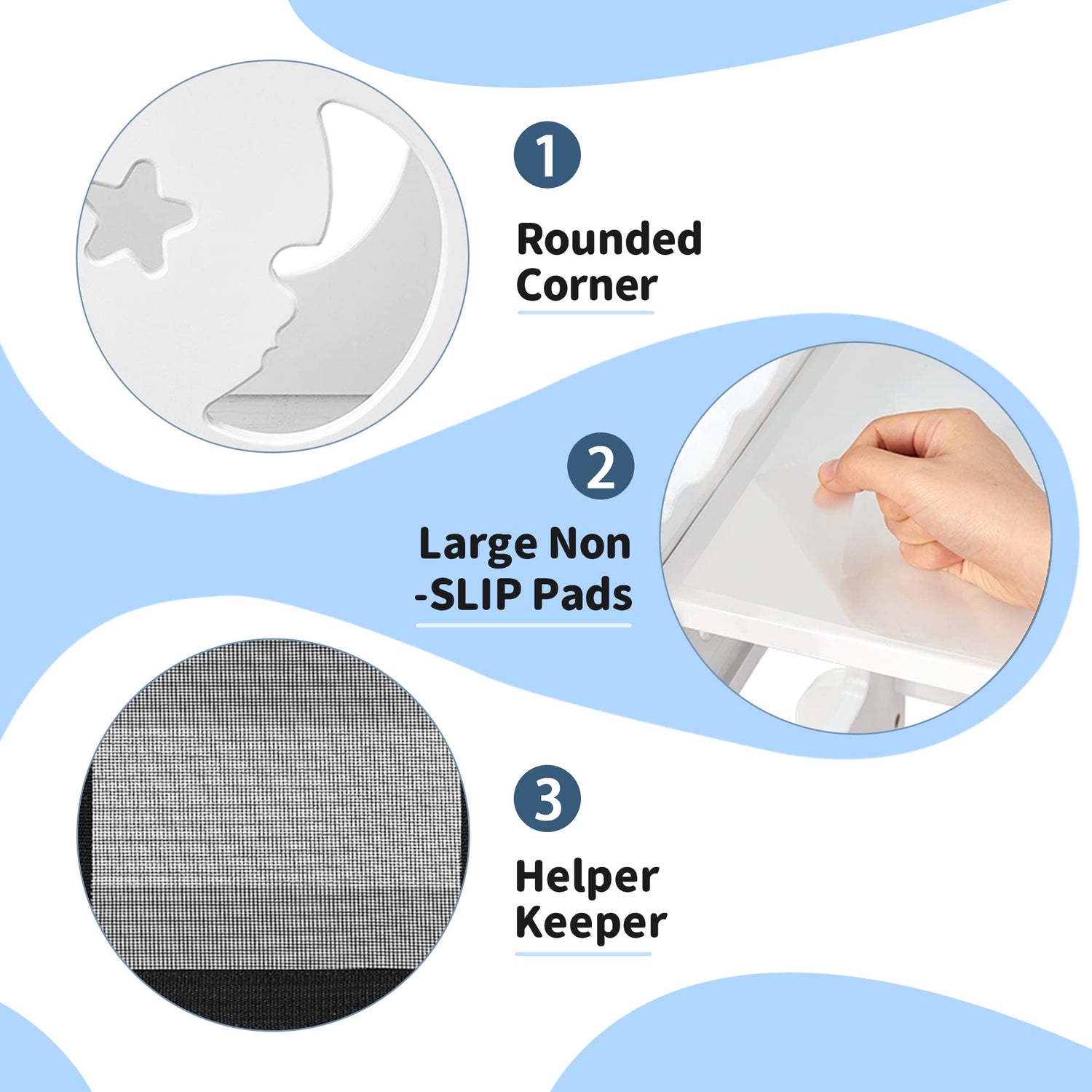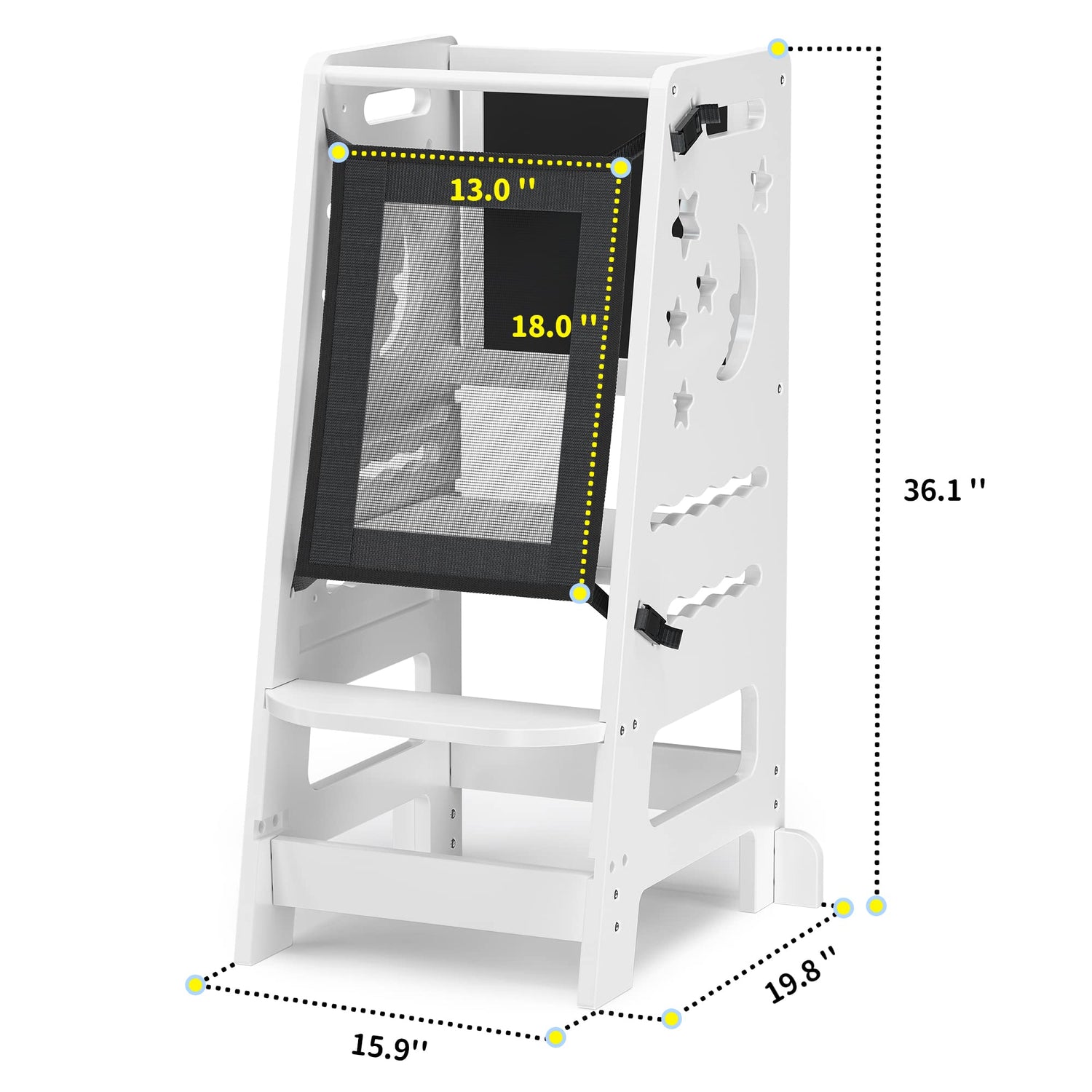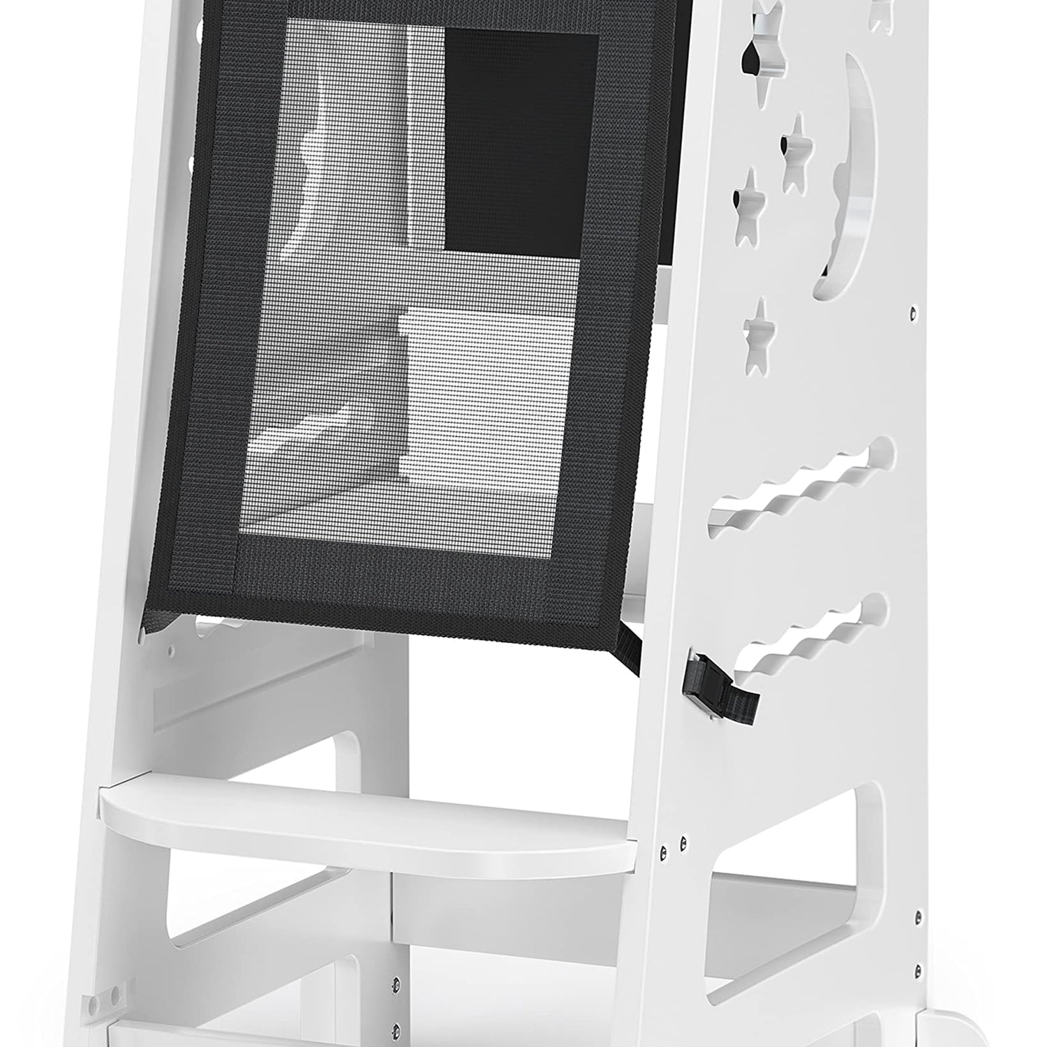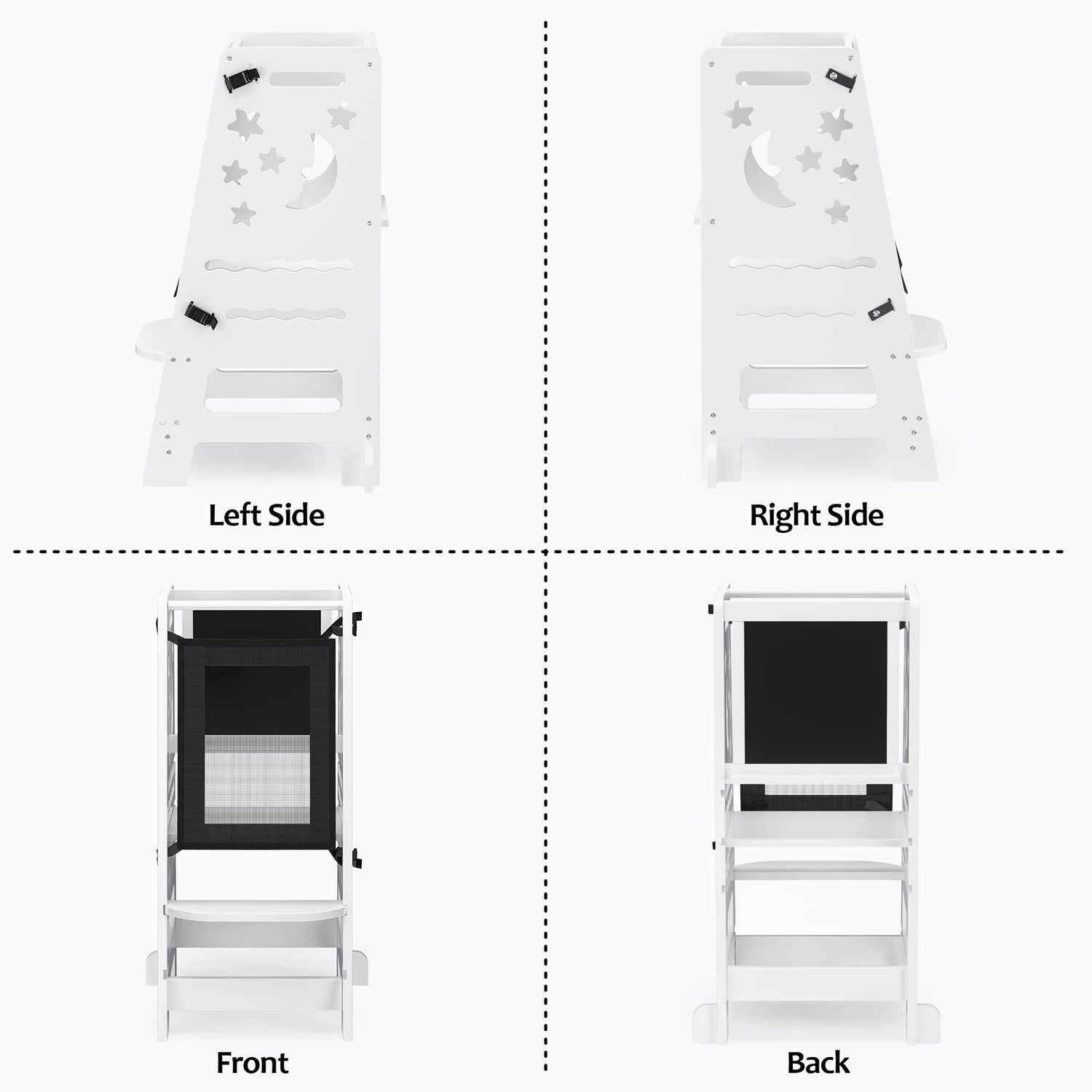 - 【MULTIFUNCTION】:The helper stool with black and white activity boards (Includes chalk and magnetic stickers),the child standing tower provides your kid with their own space!The side of the tower for kids are designed with stars and moon patterns.The interesting design allows to unleash their imagination and creativity.The reliability rounded corners are designed to protect children from scratches.