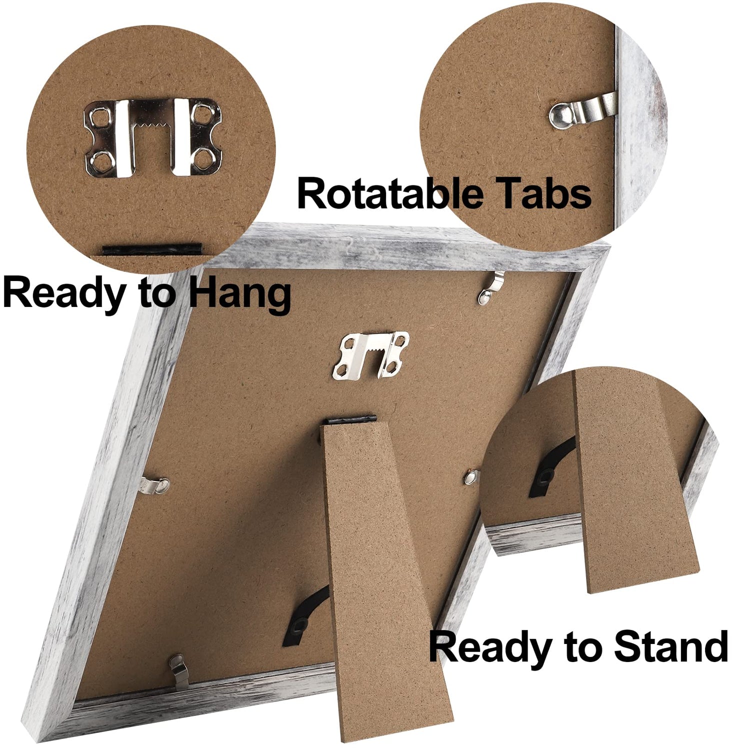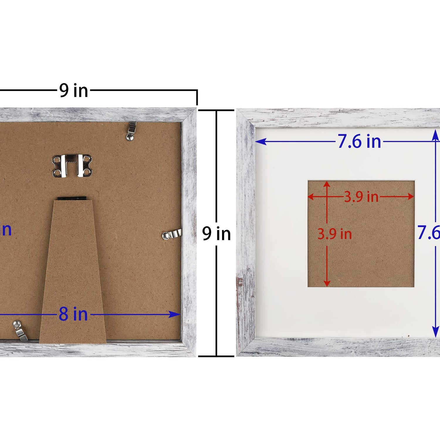 Details: 8x8 Distressed White Picture Frames Square Frames Specifications: Material: MDF Wood, Placing: Hanging/Standing Quantity: 6 Pcs Features: -rustic design, fits for keep in the bedroom, for table top or wall decorations. Displaying your cherished memories, family portraits and vacation photos. -High quality and durable MDF wood material, high definition plexiglass and hardware for tight installation and sturdy performance. -A great gift idea to show your love and affection for your beloved family and friends especially on Mother's Day, Father's Day, Thanksgiving Day, Christmas Gift and birthday!