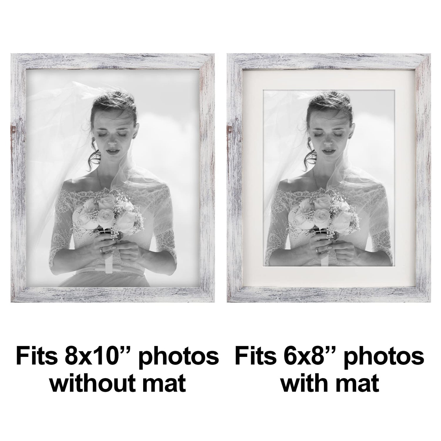 - 8x10 Picture Frame: 2 Pack Distressed White 8x10 Picture Frames, finished with a rustic style accents. Giving you the distressed look. It's great for wall or farmhouse decor.