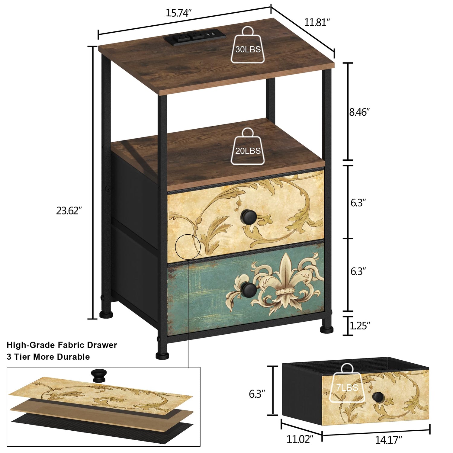 Tohomeor Nightstand with Charging Station USB Outlet and LED Light End Table Dresser with 2 Fabric Drawers Open Storage Shelf for Bedroom Living Room Sofa Beside (1, Multi)