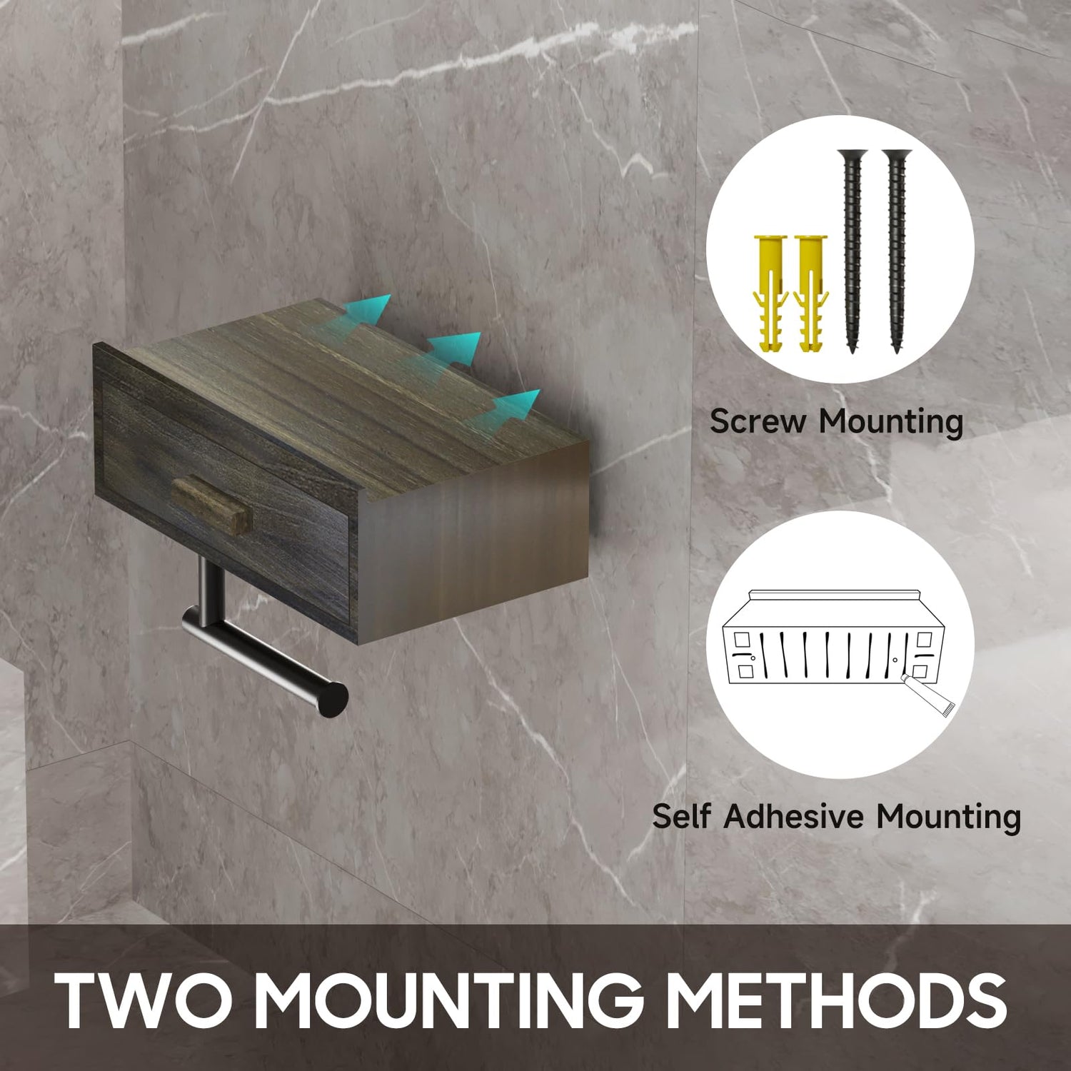 Toilet Paper Holder with Shelf,Wall Mount/Adhesive Rustic Farmhouse Toilet Paper Holder,Wipes Dispenser for Bathroom,Wood Toilet Roll Holder with Storage Drawer(Brown)