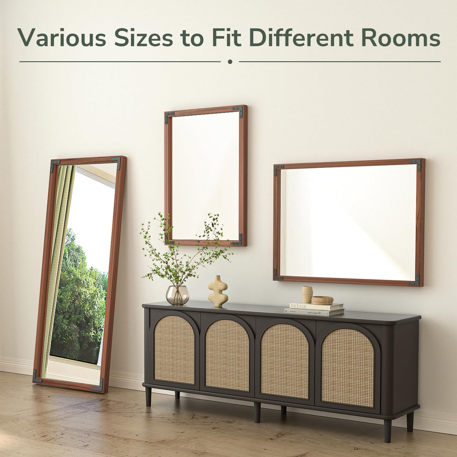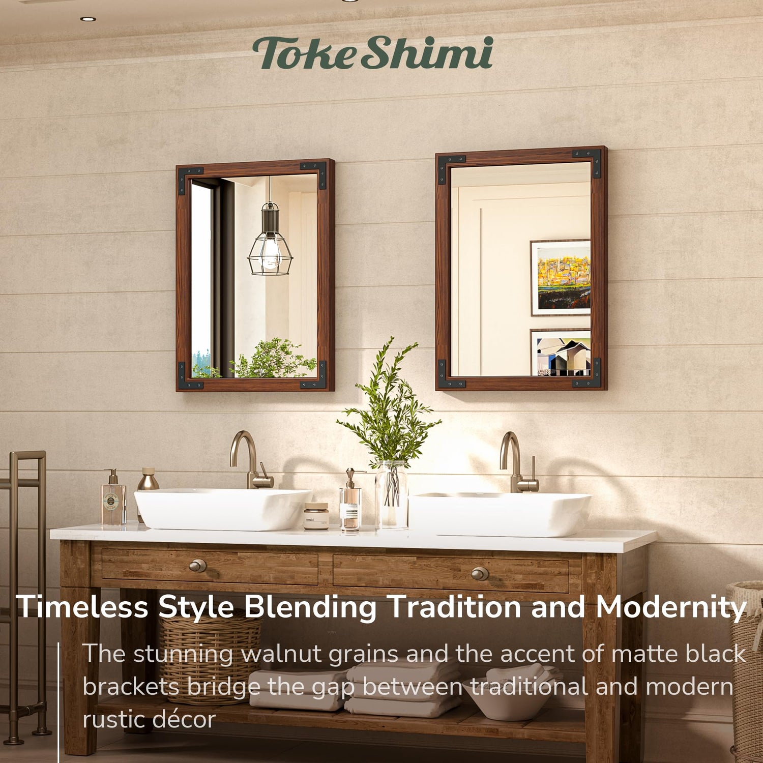- Solid Wood Mirror, High-end Walnut Accents, Sturdy & Durable: TokeShimi wooden framed farmhouse mirror chooses premium pine wood covered by walnut pattern, sturdy, durable. It adopts a 50mm wide and 38mm thick wooden frame, with beautiful matte black metal decoration.