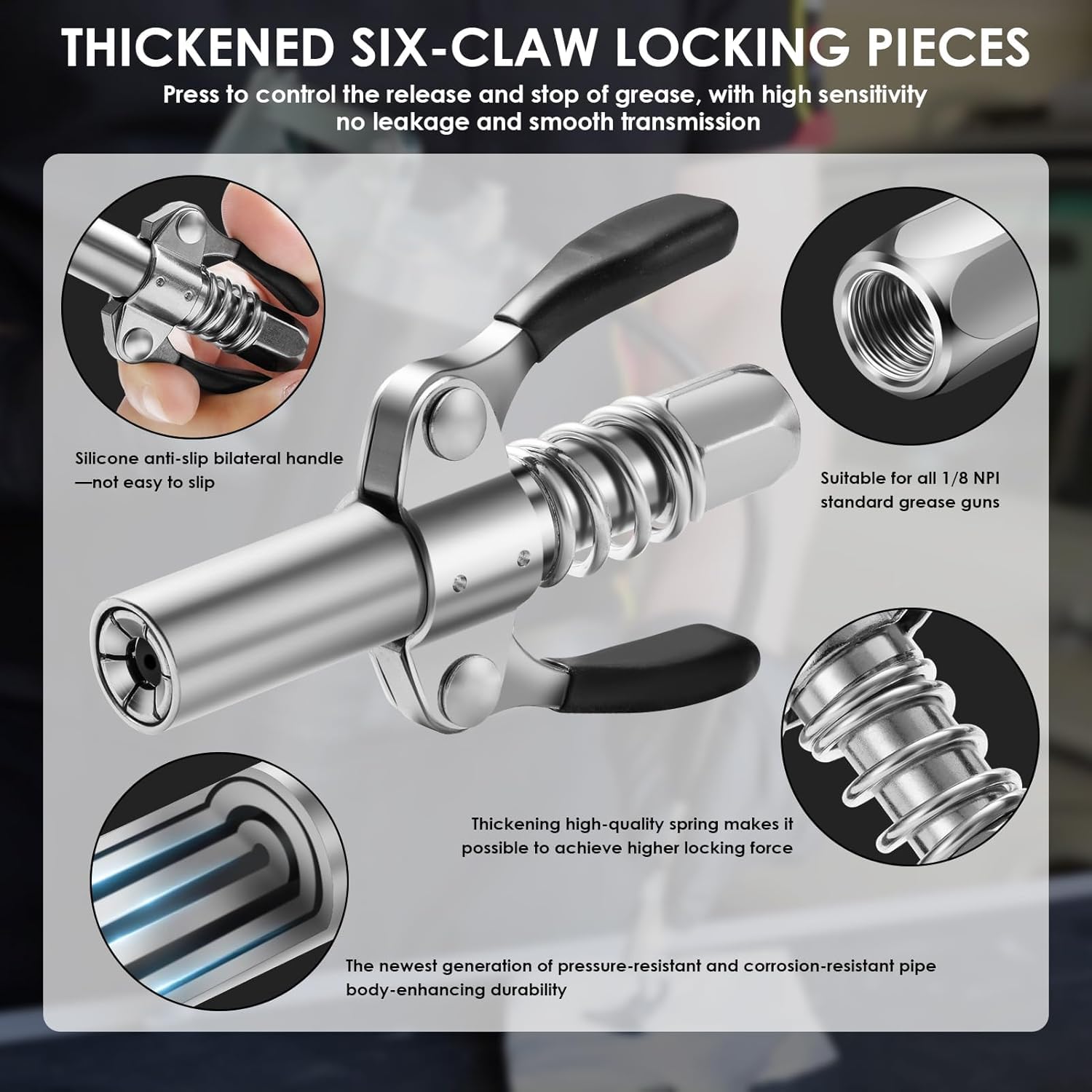 - [With Professional Coupler] : Our Electric grease gun Adapter are equipped with professional couplers, It is upgraded to a double handle and Grease gun coupler with smooth strong 6-jaw bite lock on function allows one-handed operation,quality steel, quality design principle, Wear-resistant and durable