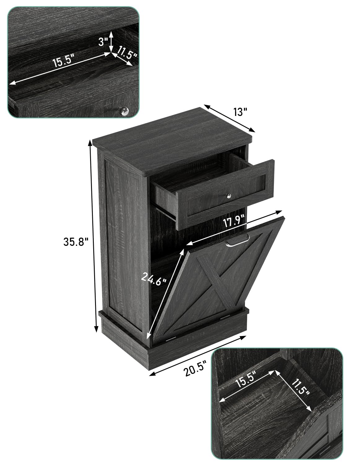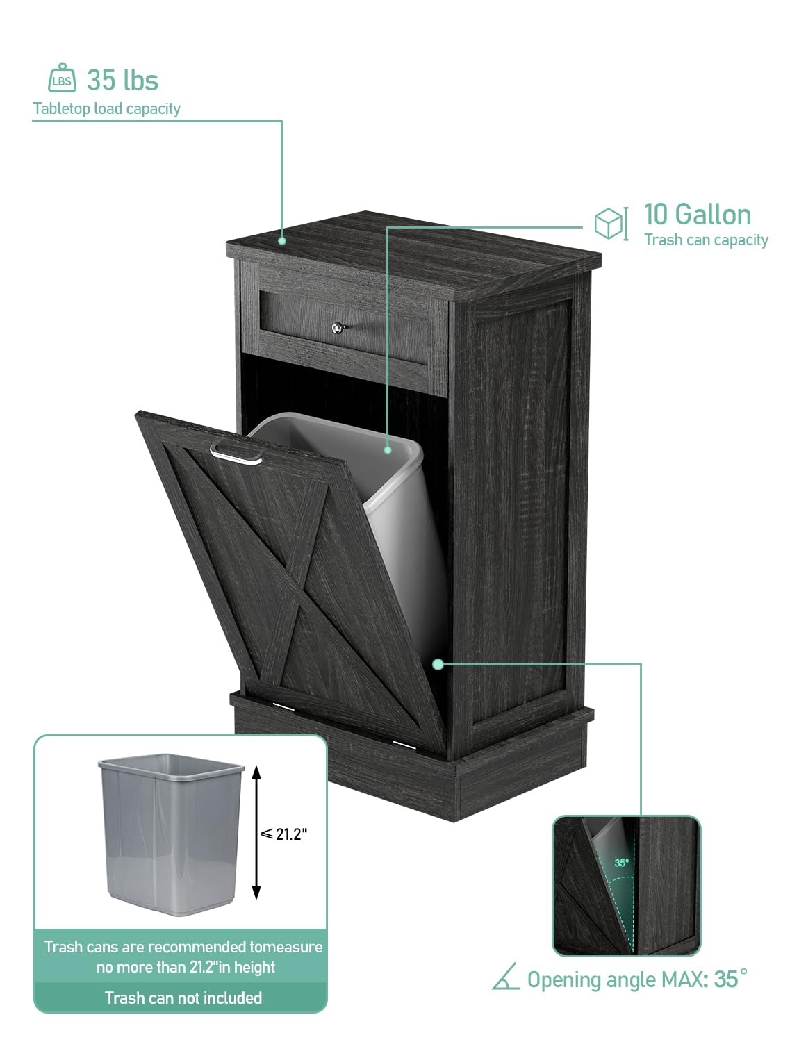 - 🏡【Durable and Stable】 35.6 "H x 20.5 "L x 13 "W cabinet support is stable enough to hold up to a 35 lb (ca. 16 kg). Our Trash can, a perfect match for a 10-gallon trash can(not included). Rubberwood top surface provides extra cutting space, and can easily withstand even a microwave and coffee maker