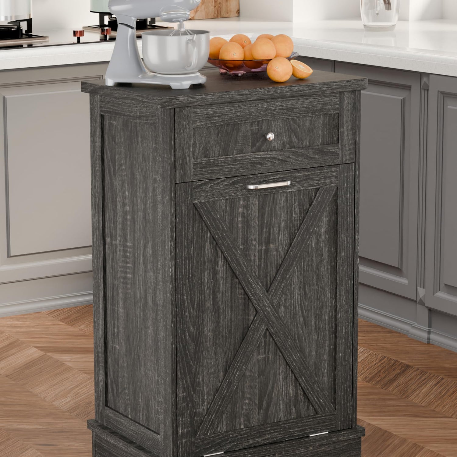 TOLEAD Tilt Out Trash Cabinet,Antique-Style Barn Door Kitchen Island with Solid Wood Tabletop & Drawer, Pet Proof Trash Can, Wood Laundry Cabinet(Oak Grey)