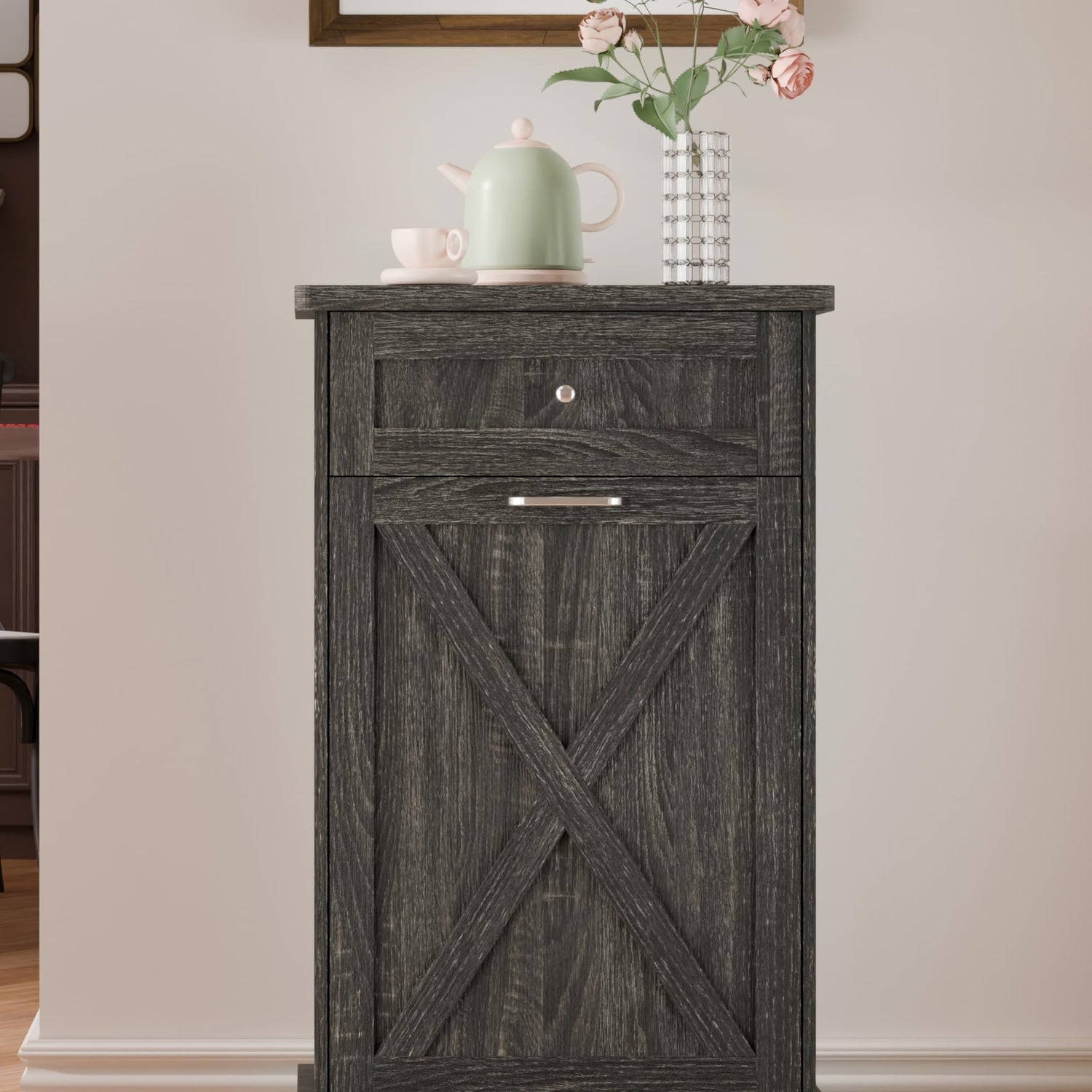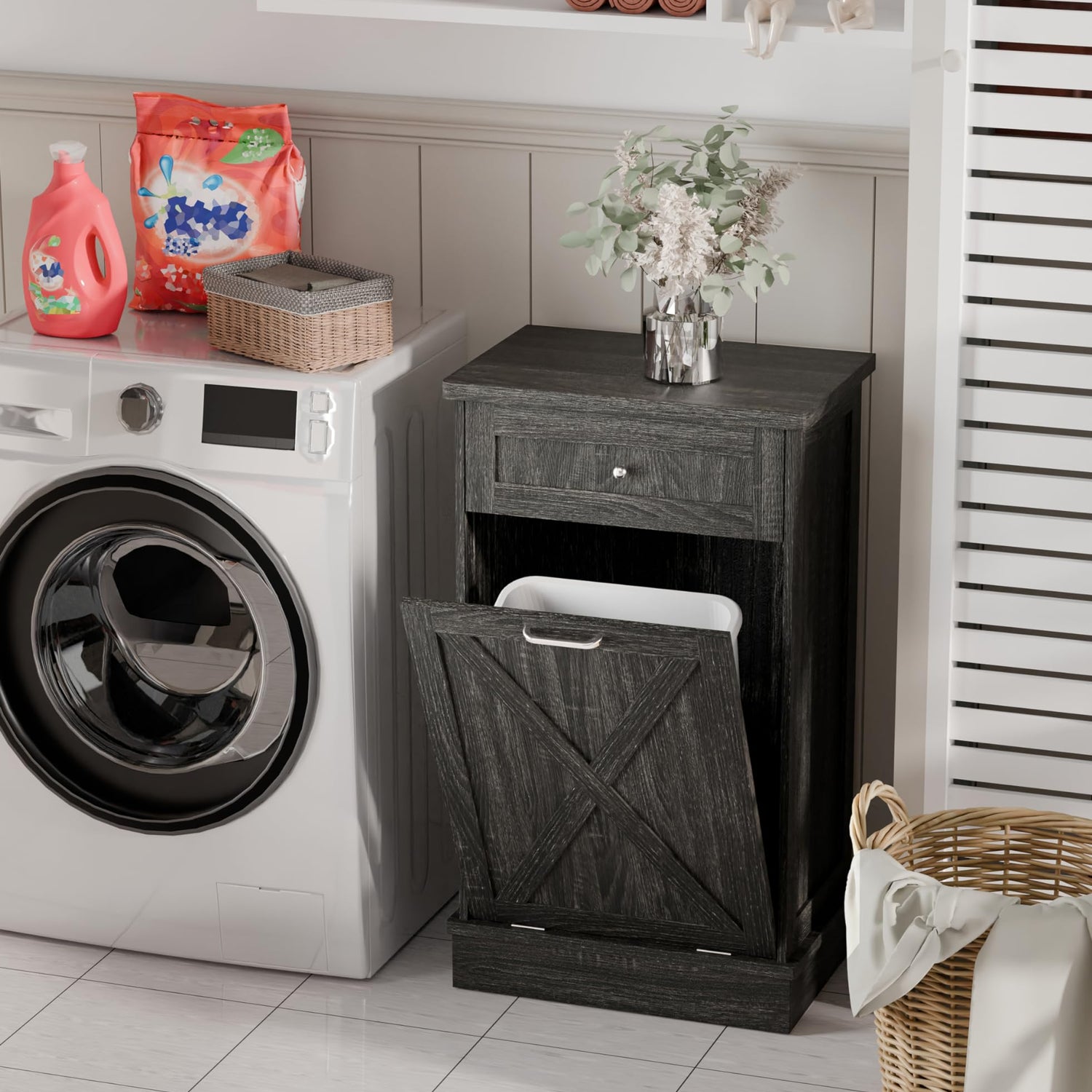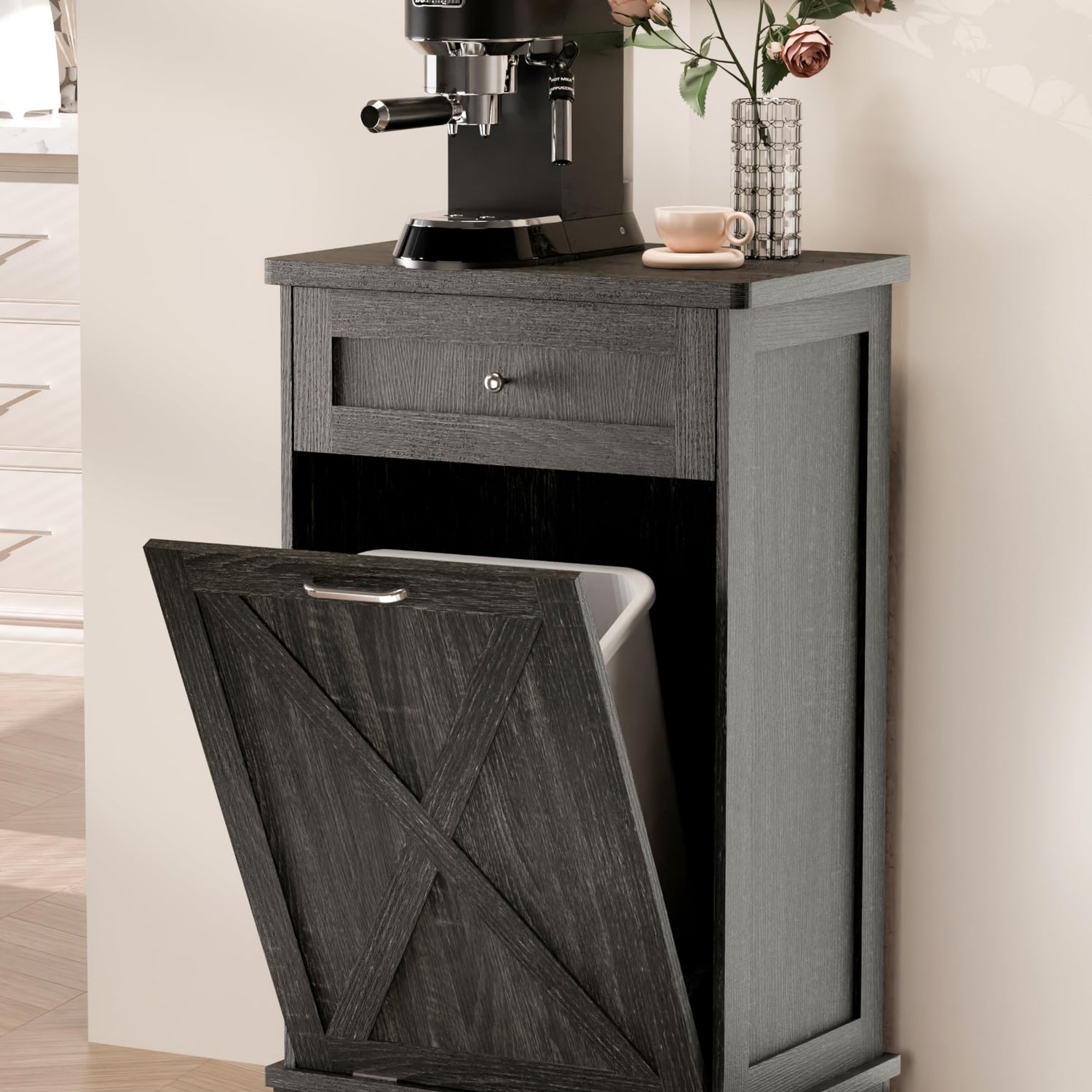 - 🏡【Space Saving and Concealment】Tilt-out trash cabinet (for 10 gallon trash cans), which can hide the trash cans well, keep the kitchen delicate and the floor clean. It also blocks odors from emanating, while your pets will never knock over the trash cans anymore