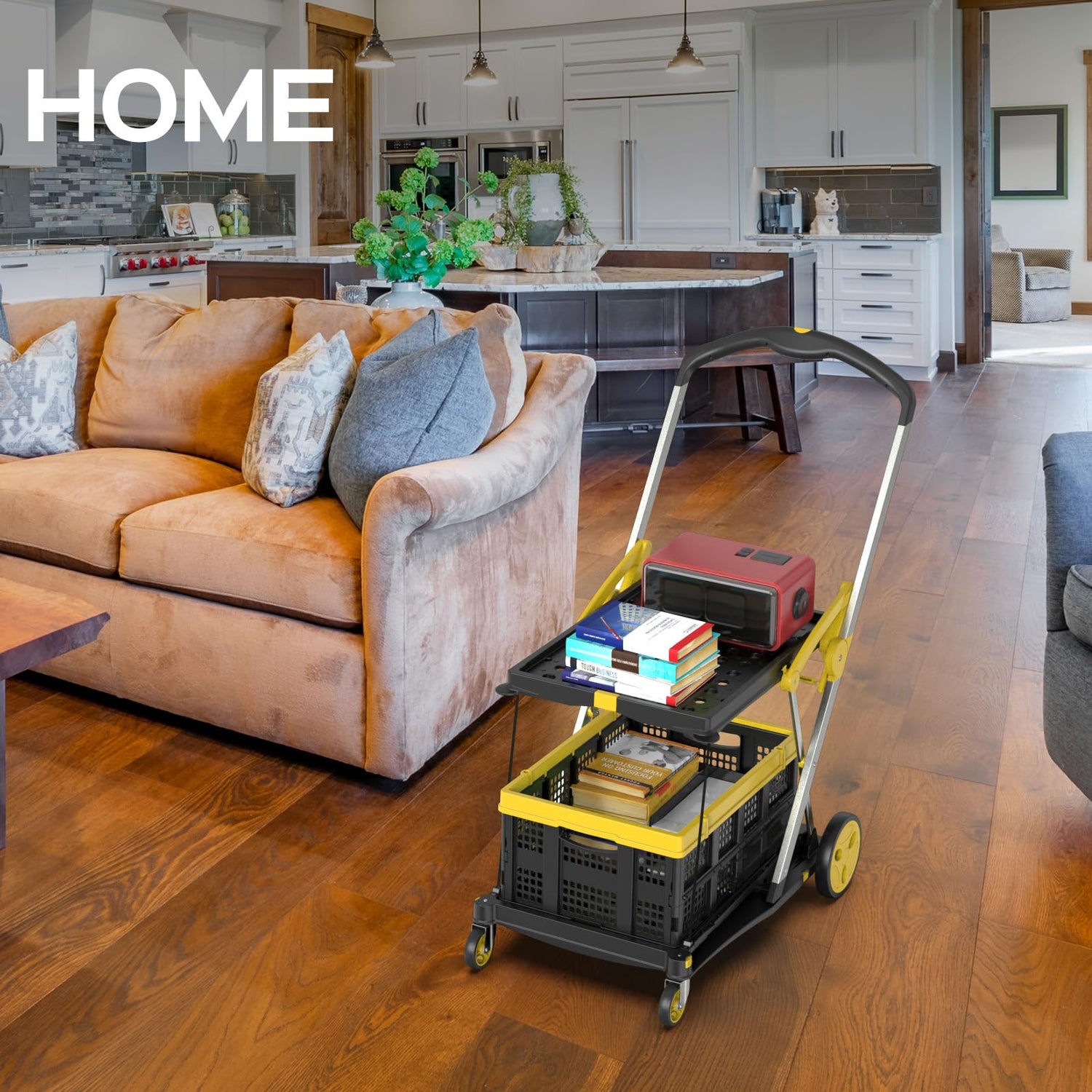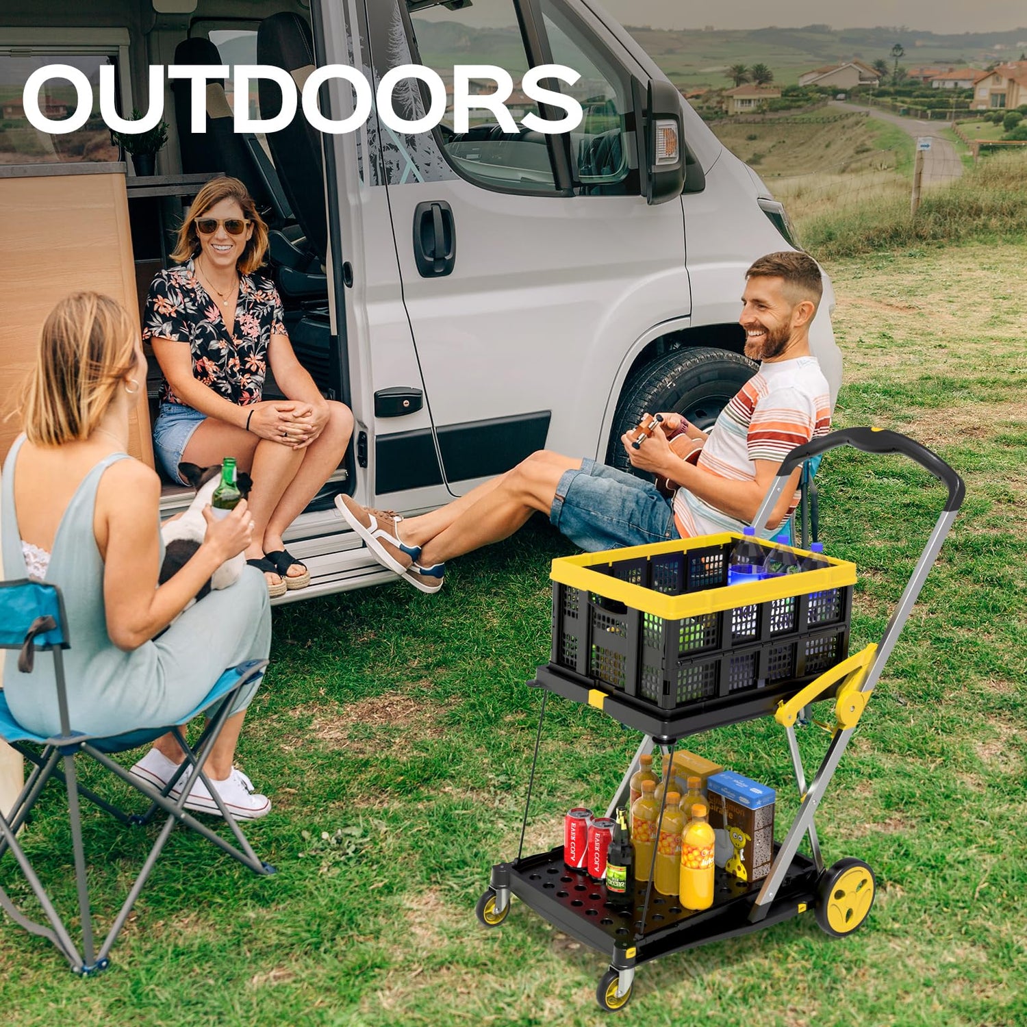 TOLRET Utility Cart, 200 lbs Capacity Folding Shopping Cart, Multi-Functional Collapsible Cart, Platform Hand Truck with Foot Brake, Grocery Cart on Wheels Foldable with Storage Crate, Yellow