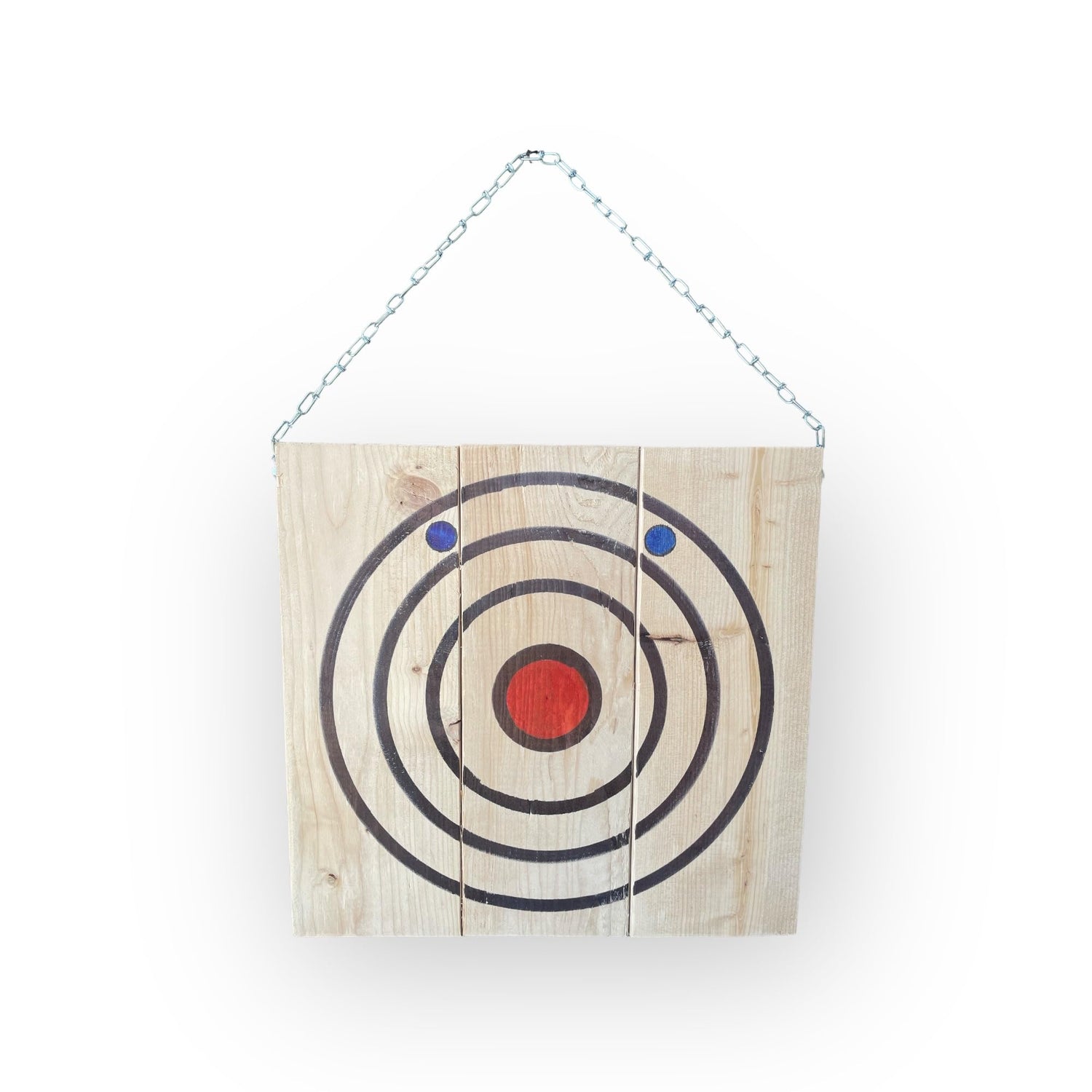 Details: Heavy duty Knife throwing target, manufactured and sold from Austin Texas! Dimensions: 17"x4"x17" approximately 10lbs. 100% soft spruce lumber, hand painted target faces! fully installed 150* weight capacity hanging chain Set of 3 throwing knives included. (we recommend wetting down the target with a spray bottle and thin blades for board longevity, we also give weapon recommendations) These targets make a great gift and party favor for any event. Hang from a tree, post or fence and your good to go straight from the box! WE SHIP NEXT DAY! Please reach out if you have any questions or concerns!