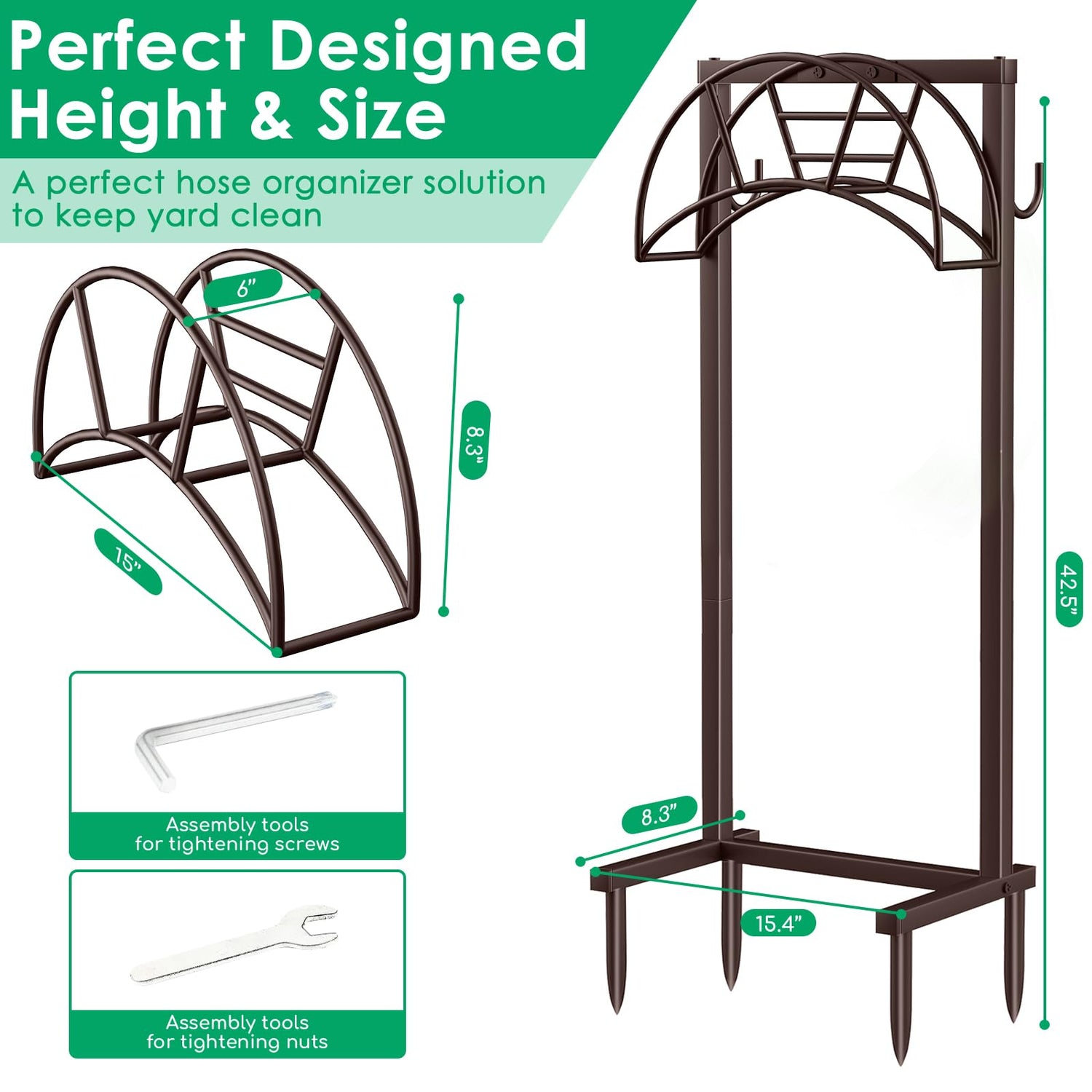 TomCare Garden Hose Holder Upgraded 4 Spikes Water Hose Holder with 2 Tool Hooks Sturdy Hose Reel Holds 150ft Hose Freestanding Hose Stand Hose Hanger Hose Storage for Outside Yard Lawn, Bronze