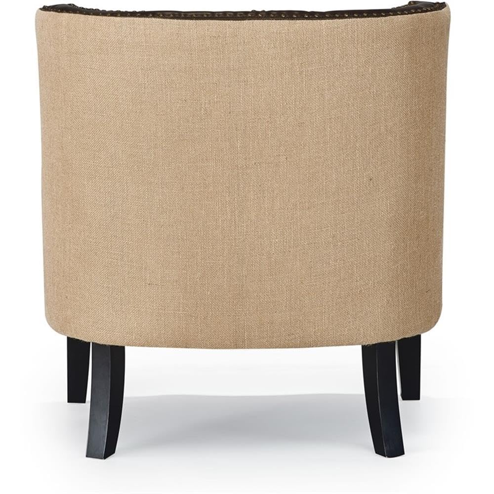 Details: The distinguished charm of this attractive leather Club chair will envelop you in both style and comfort. Brown faux leather and tan natural fiber burlap combine in a stunning traditional style for a timeless look you'll love. Brass nail head trim is hammered by hand for a unique, artisanal touch. The low sloped armless design fits seamlessly into most décor schemes. The high quality channel tufted Back offers plenty of comfort and support. Pair this Brown accent chair with your favorite ottoman and cozy up with a good book. Removable cushion cover for easy cleanup.