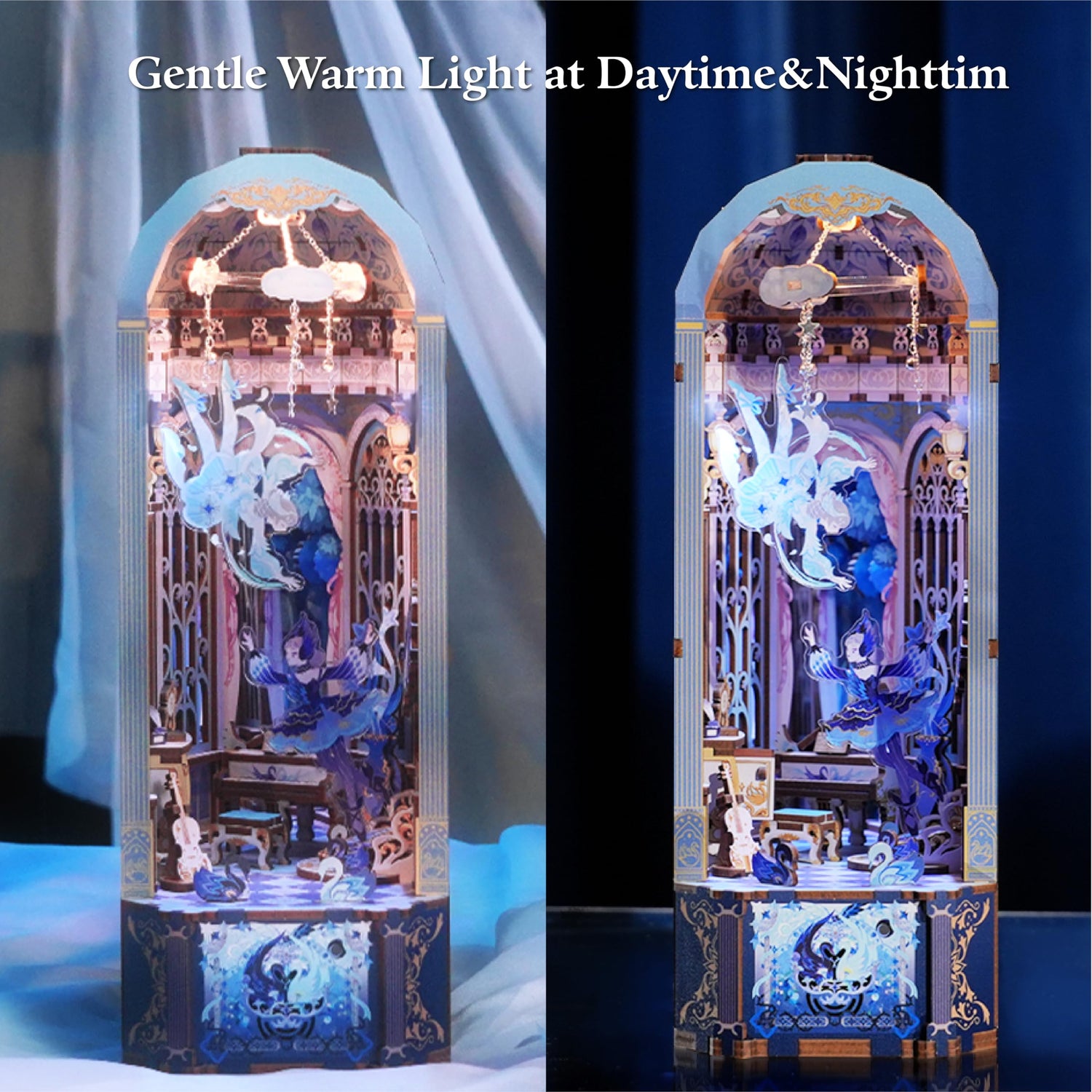 - 【Swan Dream】Tonecheer DIY Book Nook Kit shows the white swan and the black swan dance the swan dance accompanied by elegant music in the dreamy European castle. The starry chandelier lights up, the pure white swan dances gently and stretches, tough black swan elegantly pirouette, together forming a beautiful scene.