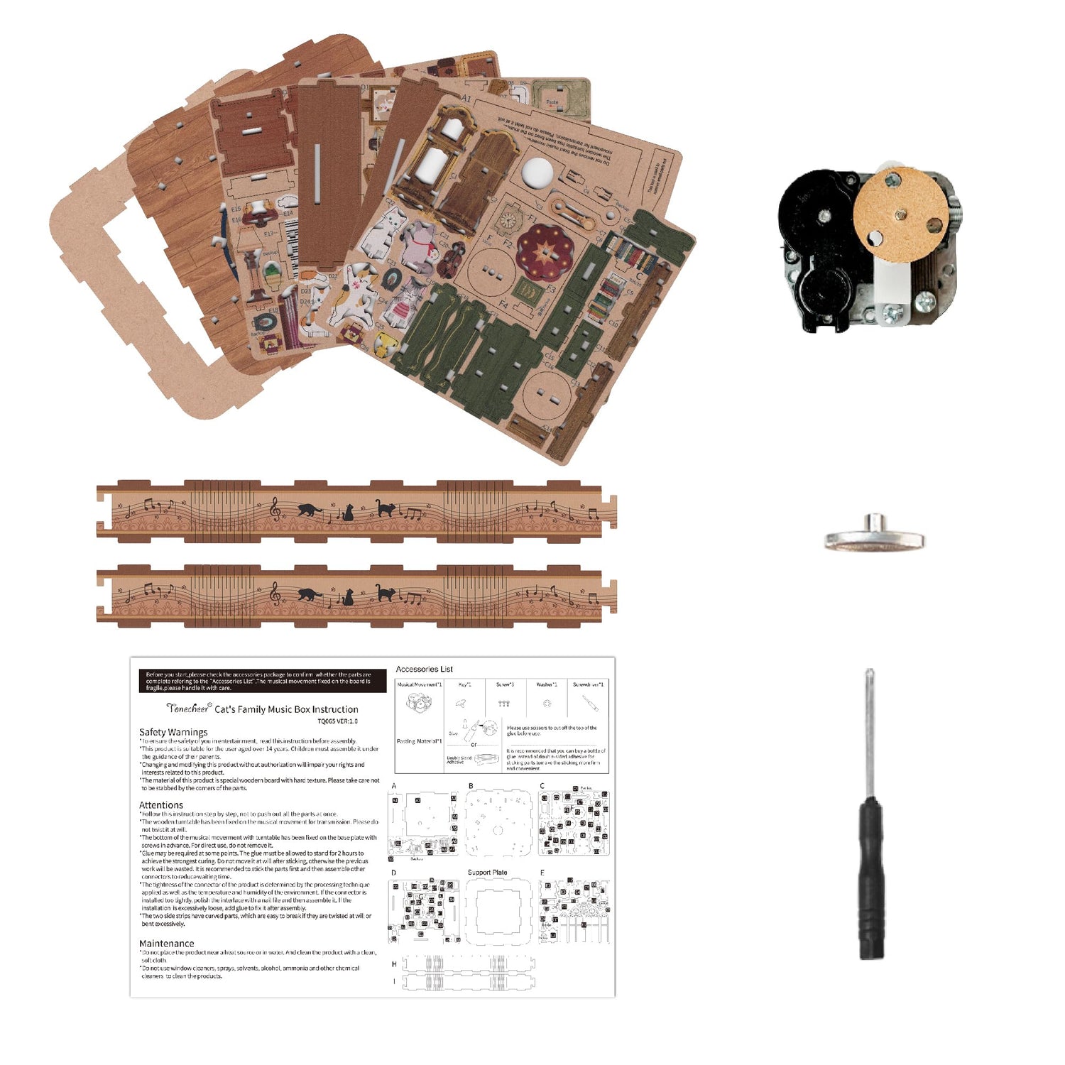 - 【Cats Family】In Tonecheer DIY music box kit, the relaxing music plays and the cat family gathers together. The dancing kittens in the center keep circling around with the music, while on the side, Grandma Cat's rocking chair gently rocks with the rhythm, which is warm and cozy.