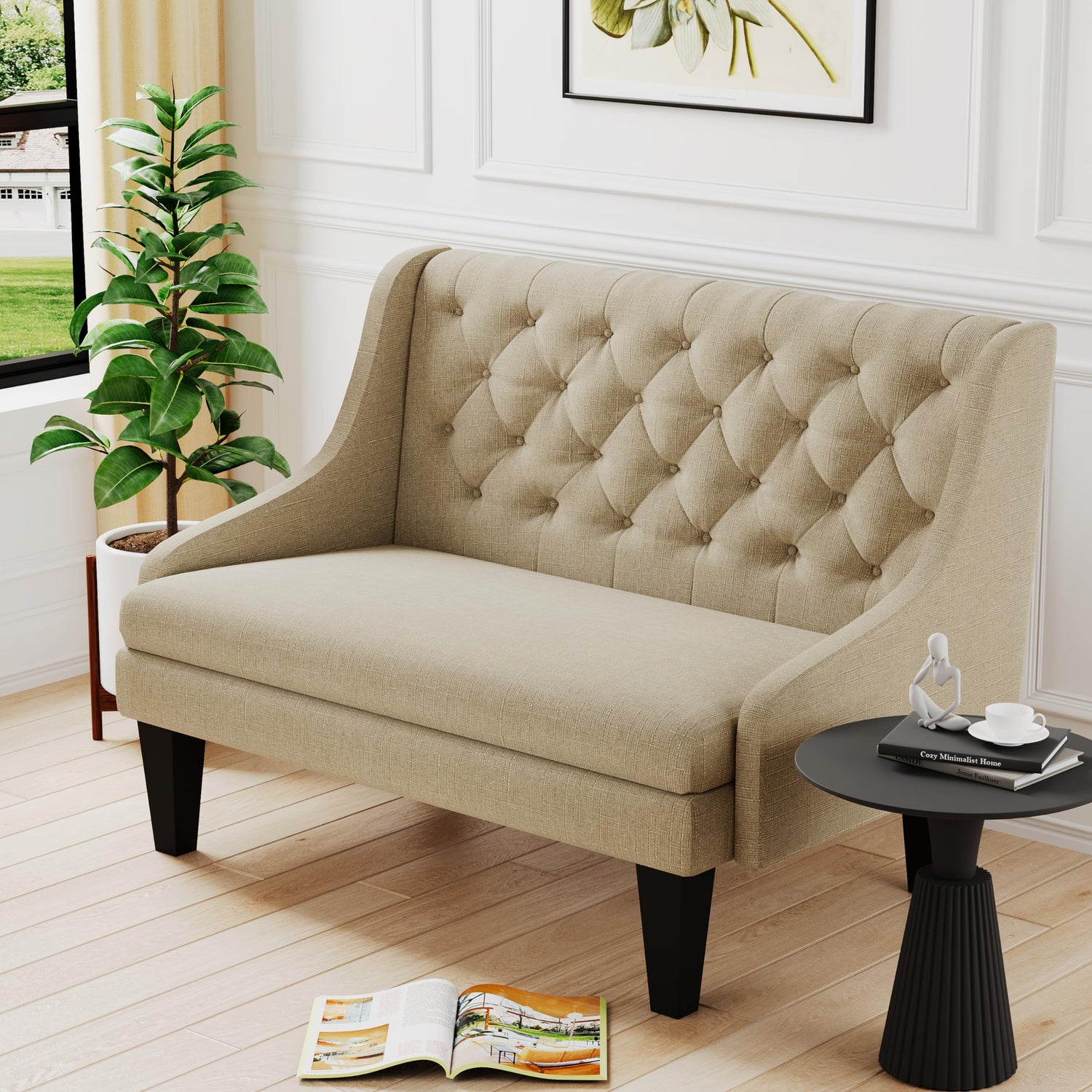 Tongli 50" Small Modern Loveseat Settee Sofa Linen Fabric 2-Seat Sofa Couch Tufted Love Seat Dining Bench with Back Upholstered Banquette Sofas for Living Room Bedroom Small Space Entryway Tan