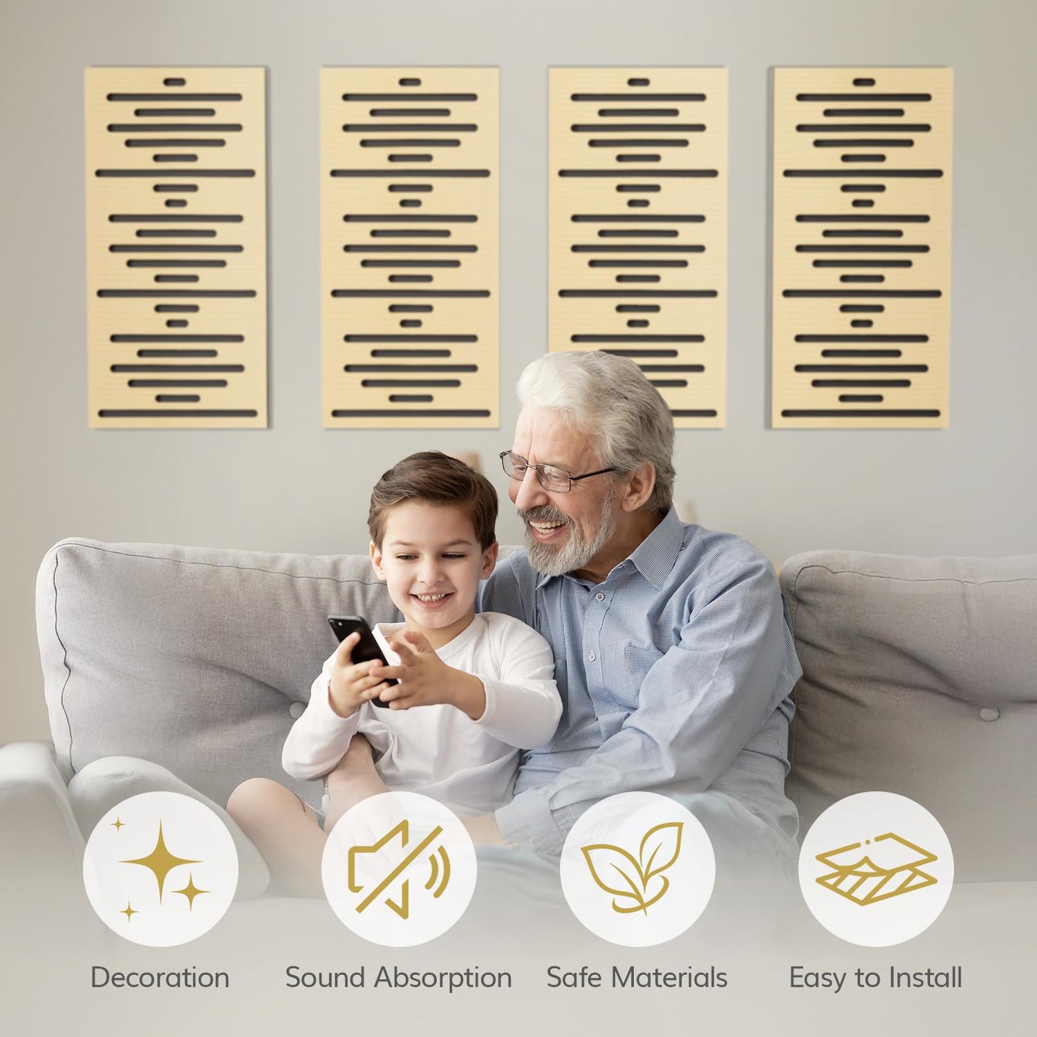 TONOR 4-Pack Acoustic Wood Wall Panels, 23.6” * 11.8” * 1.9” 3D Self-adhesive Wall Panel, Three-layer Soundproof Tiles for Echo Absorbtion, Acoustical Barrier of Polyester Fiber, wood, Burly Wood